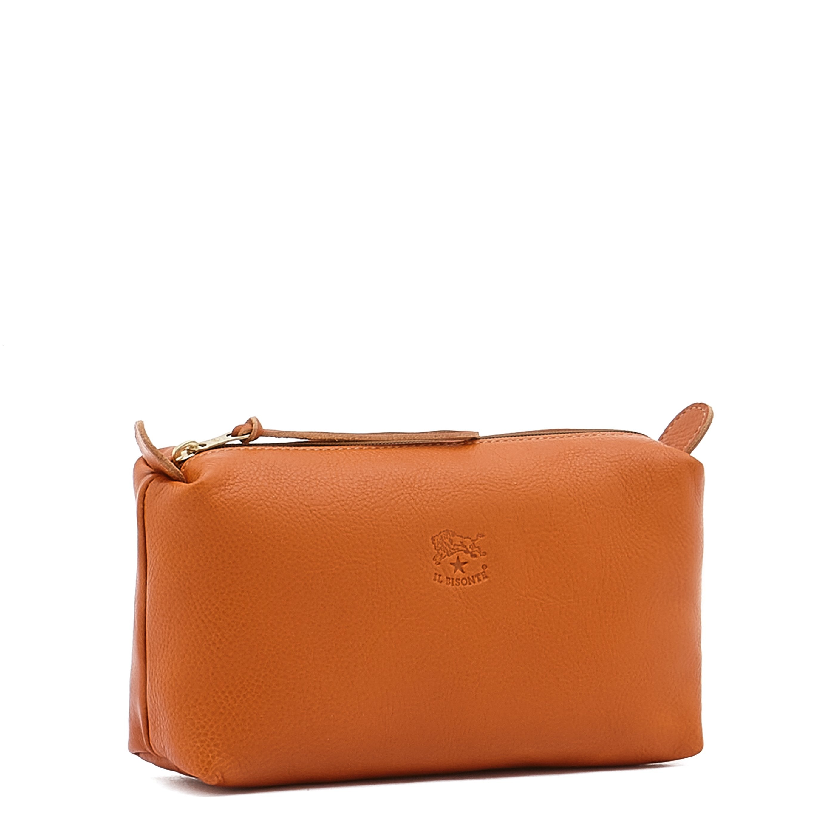 Beauty case in vegetable tanned cowhide and cotton canvas. Made in Italy by master craftsmen in Il Bisonte's 30 km supply chain.Zippered closure with brass pull and cowhide leather strap. The interior, lined in cotton canvas, contains an open pocket.