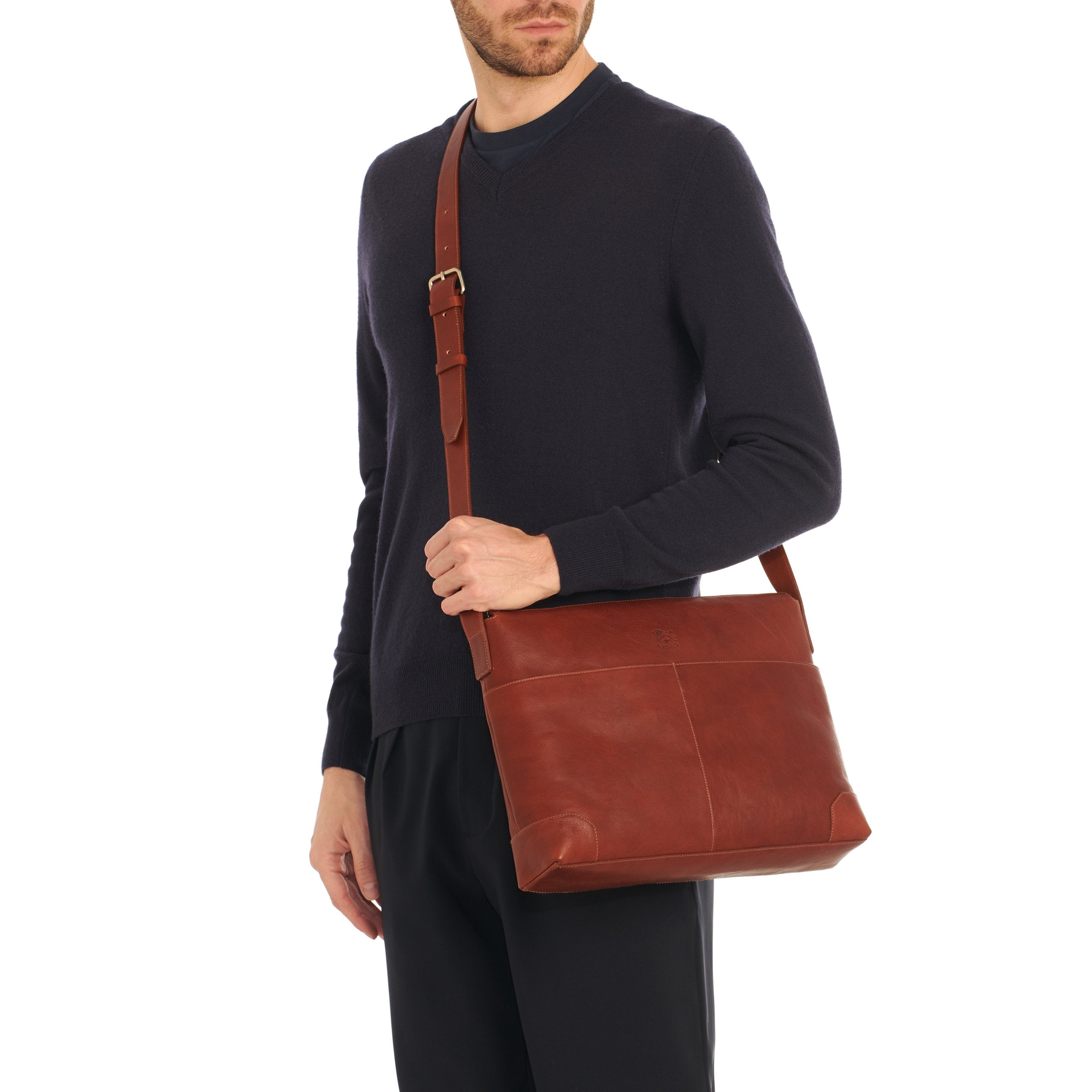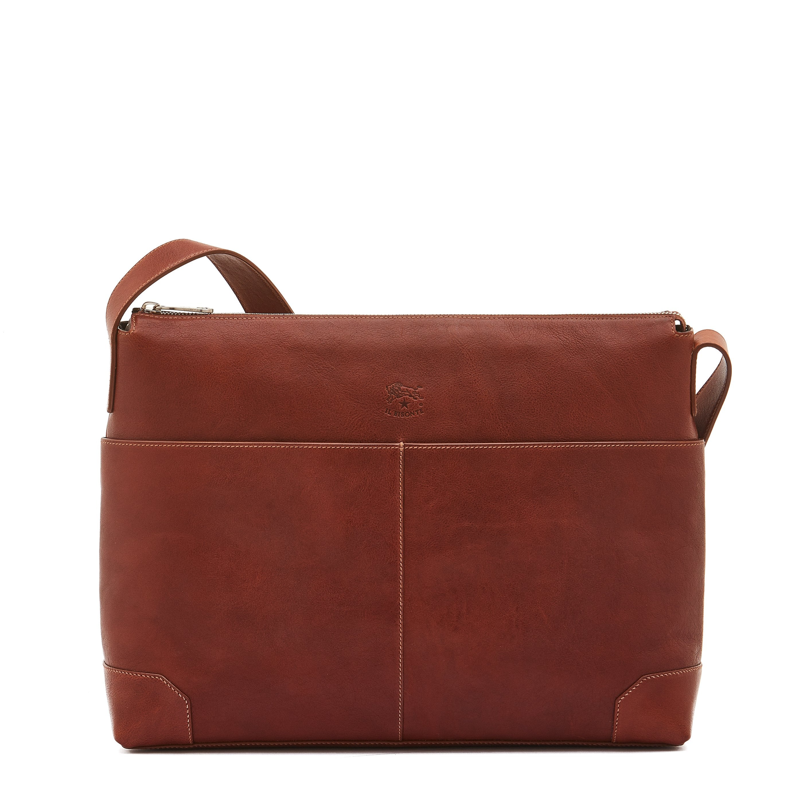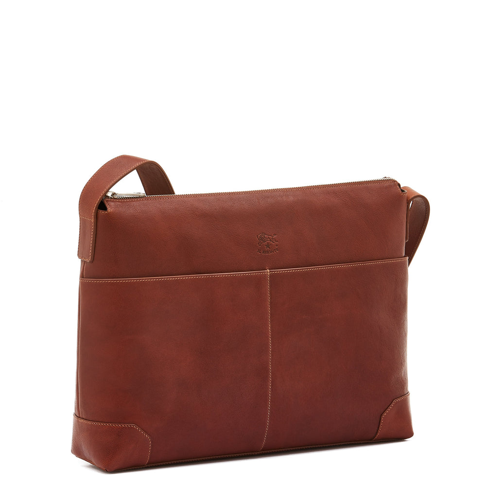 Vintage vegetable-tanned leather messenger. Adjustable shoulder strap with buckle. Zip closure. Two exterior front pockets lined in cotton canvas. Inside is lined in cotton canvas and contains a zippered pocket.100% made in Italy.