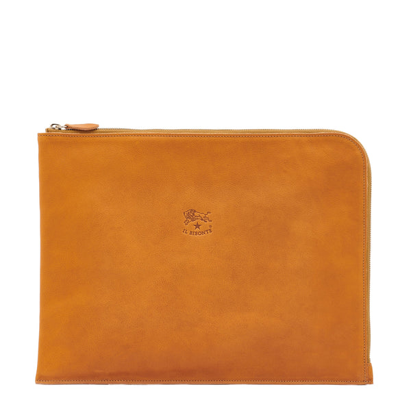 Portfolio in vegetable tanned cowhide leather with zip closure and waterproof lining. Made in Italy by master artisans in Il Bisonte's 30-km supply chain. Zip closure on two sides. Zip pull in gold-finish brass and cowhide leather. Inside, 2 large open pockets and 4 fabric pockets, lined in waterproof Scottish canvas.