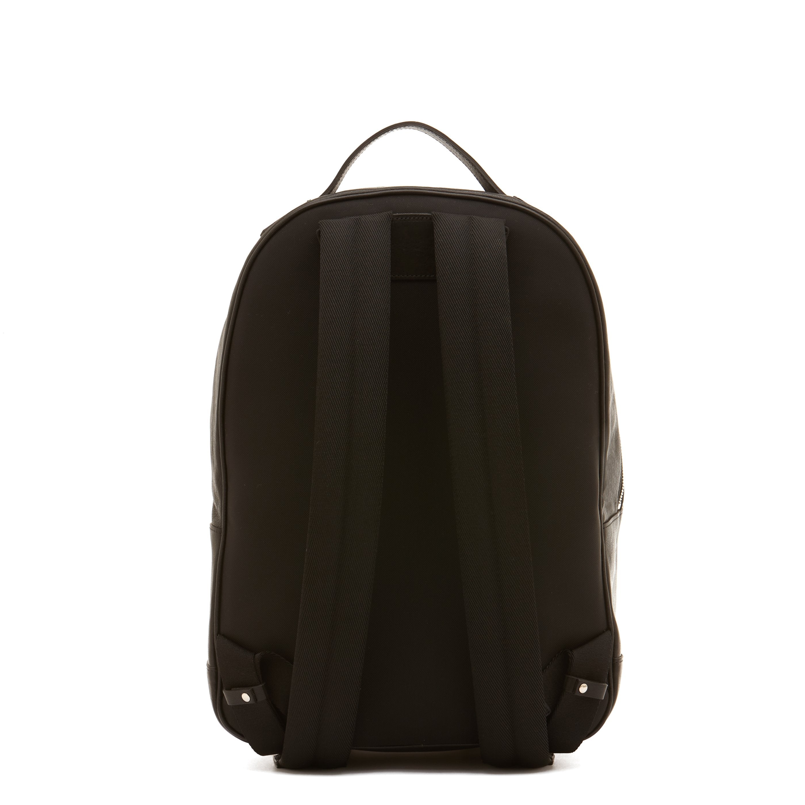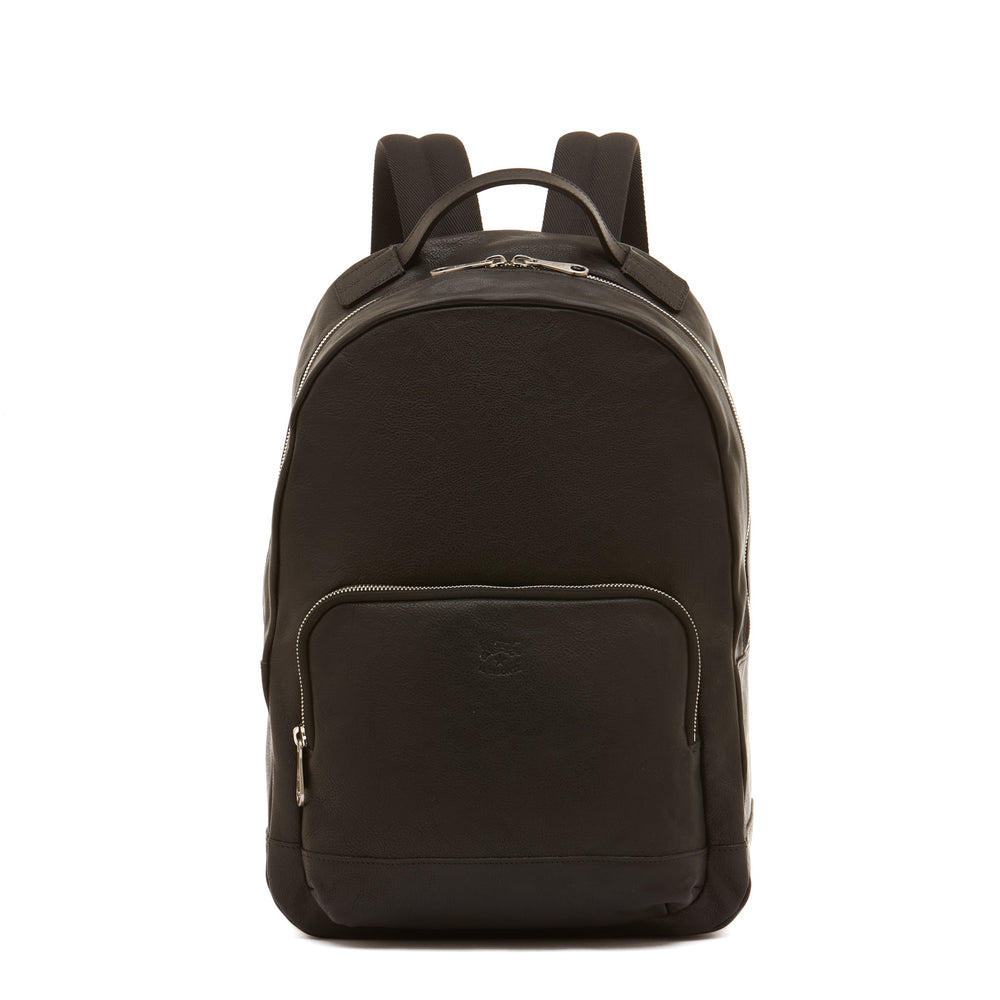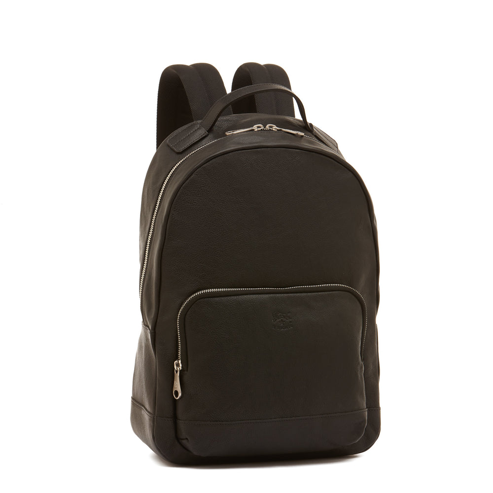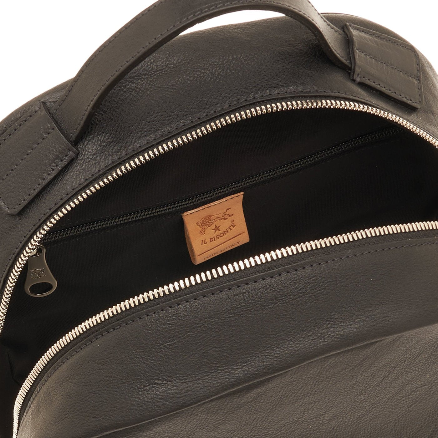 Backpack with adjustable padded shoulder straps and back. Leather handle. Front zippered pocket lined with cotton canvas. Double-slider zipper closure. Cotton canvas-lined interior includes one zippered pocket and one padded open pocket. 100% made in Italy, produced in the province of Florence by the master artisans of Il Bisonte's 30-Km supply chain.