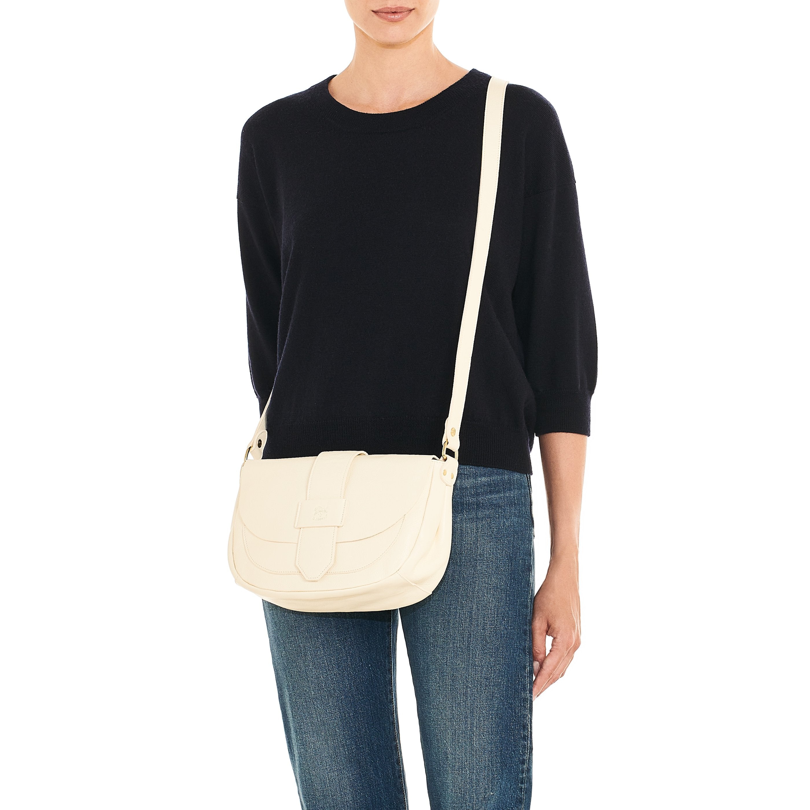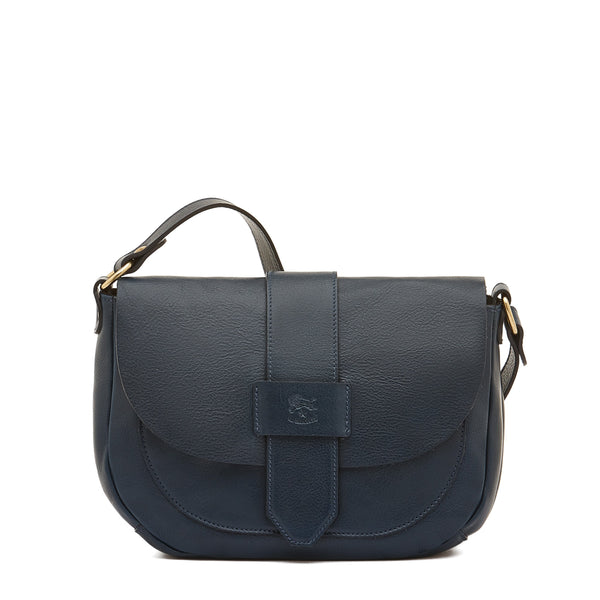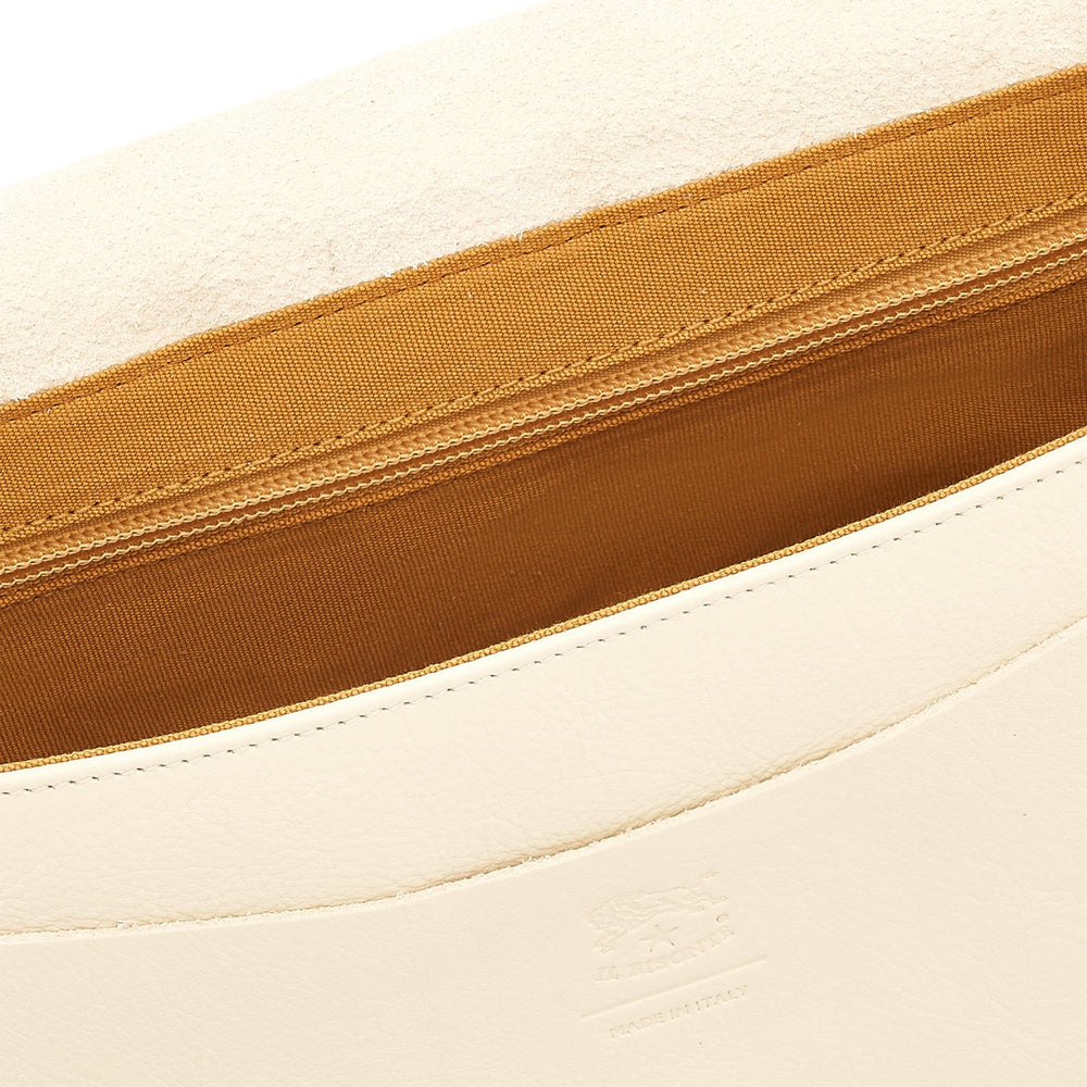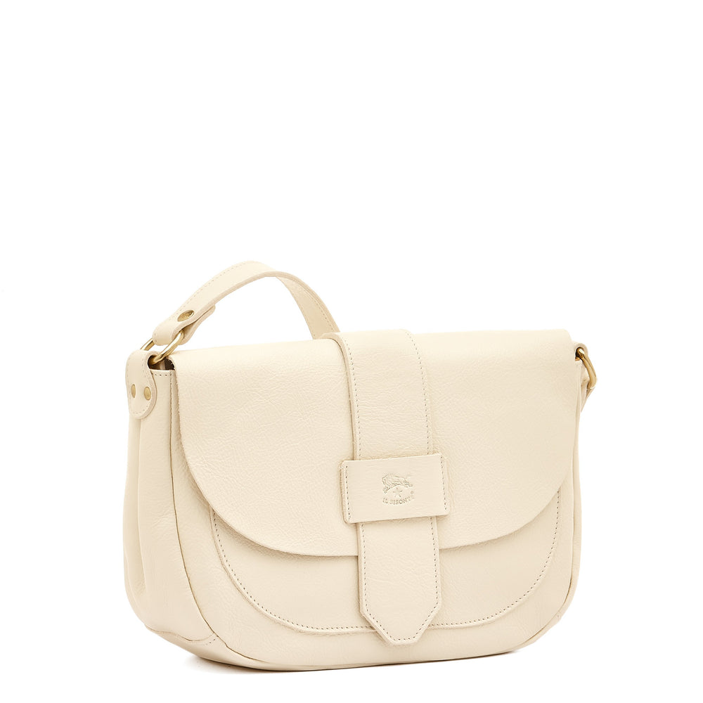 Women's bag in soft vegetable-tanned cowhide leather, can be worn on the shoulder or crossbody. 100% made in Italy, produced in Tuscany, in the province of Florence by master artisans in Il Bisonte's 30-km supply chain. Adjustable shoulder strap with buckle. Front flap with hidden magnetic snap button closure. Open flap pocket featuring iconic wave design. Back pocket with button. Lined in cotton canvas. Internal zip pocket. Il Bisonte bags and accessories are made to last a long time while preserving their beauty and uniqueness. To care for cowhide leather use the natural calendula-based cream kit.