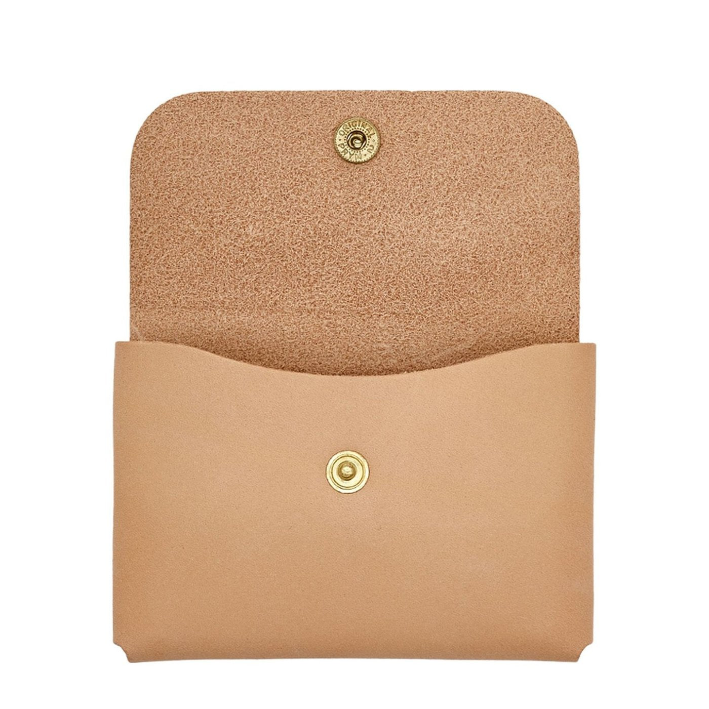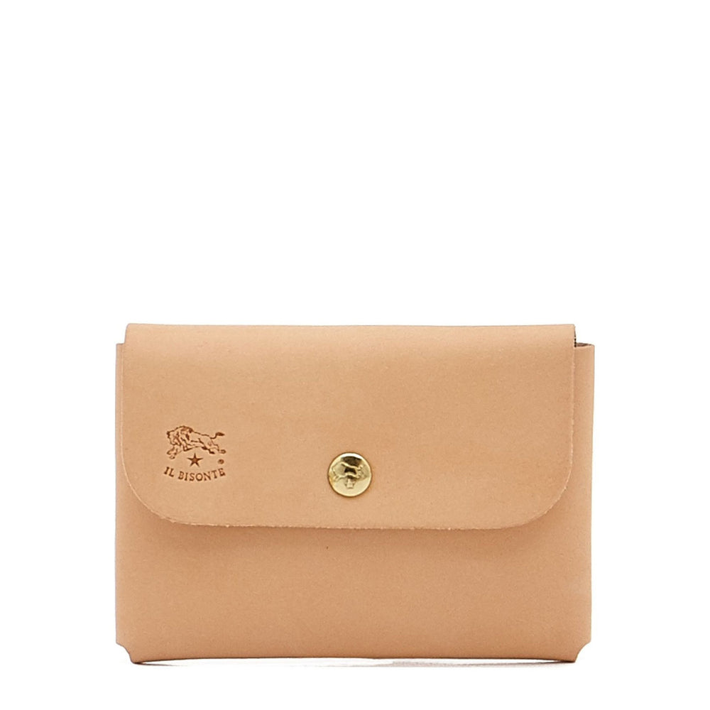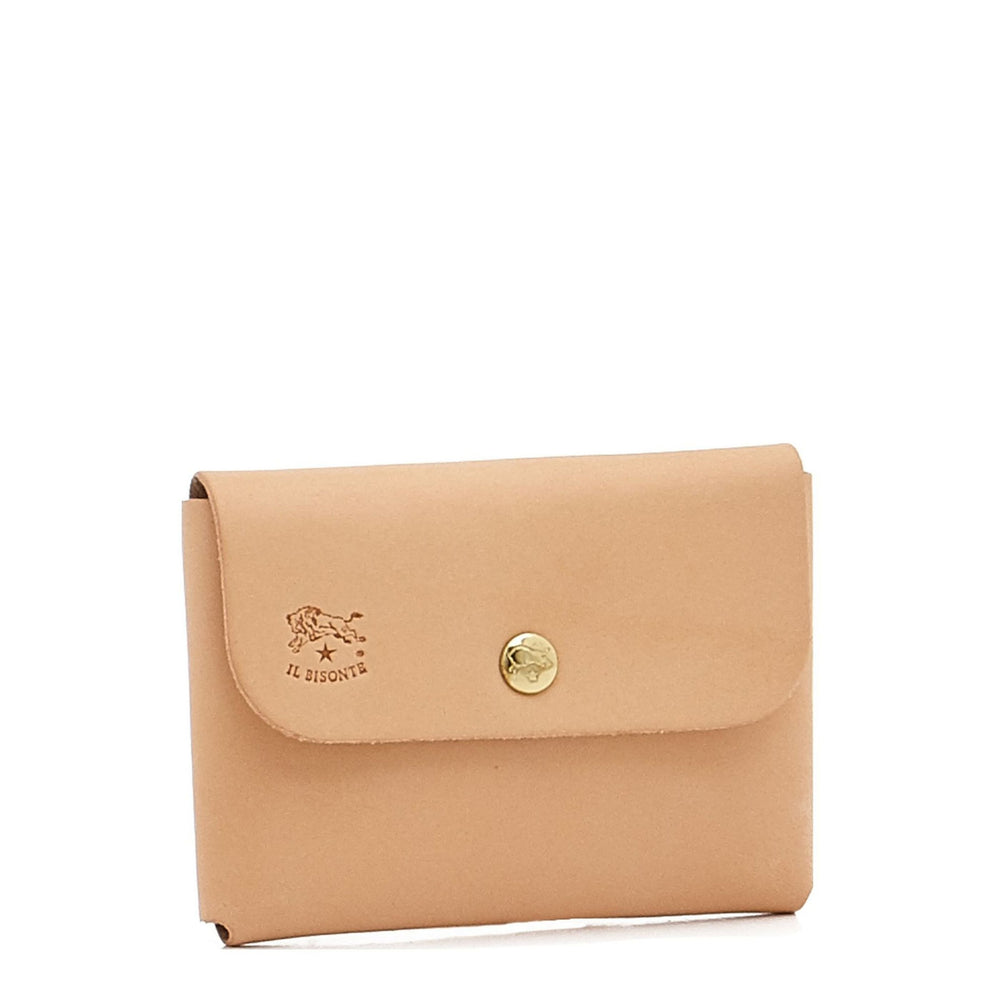 Unisex card case in vegetable tanned cowhide leather, with flap and raw cut edges. Made in Italy by master artisans in Il Bisonte’s 30 km supply chain. Front flap with brass snap button in gold finish. Unlined.