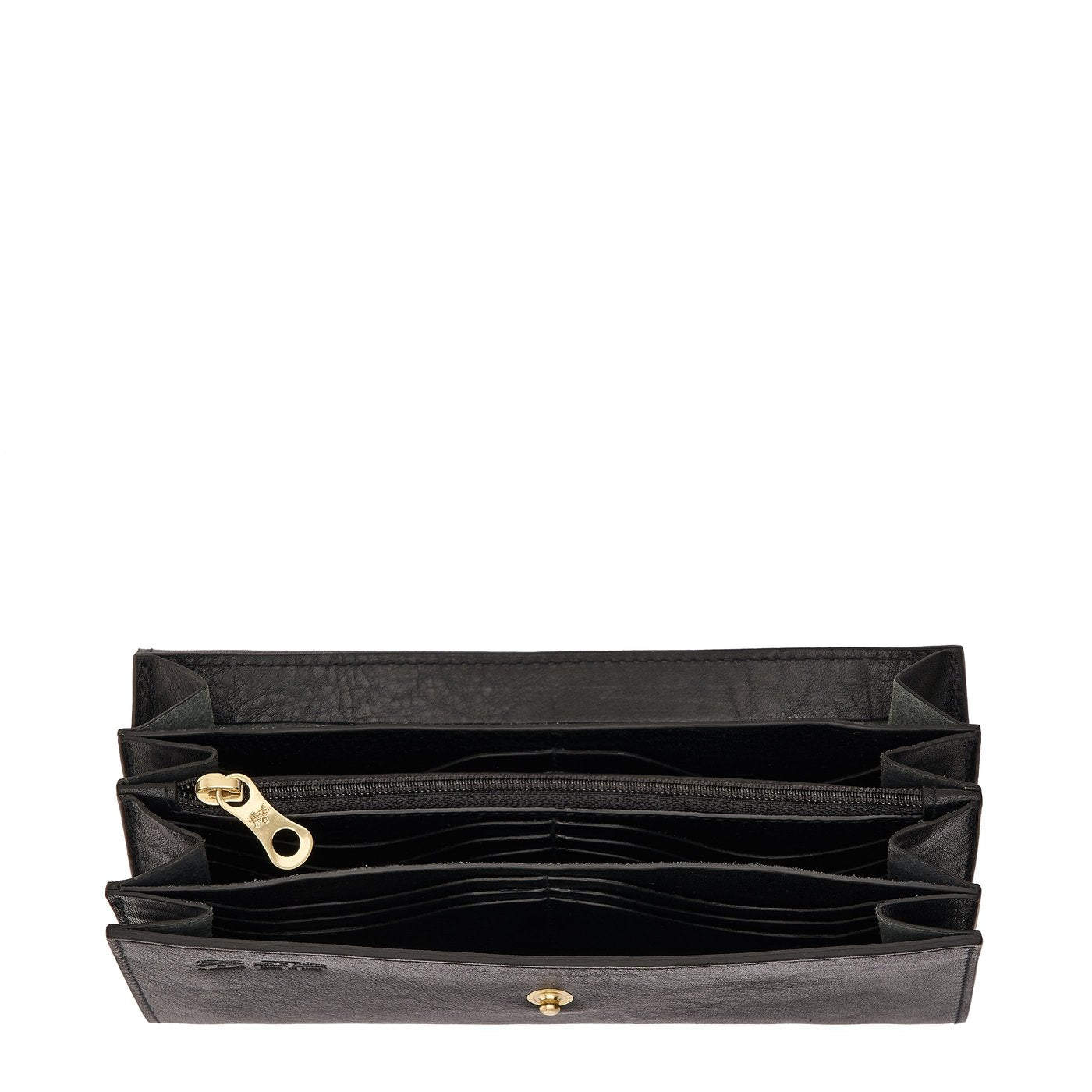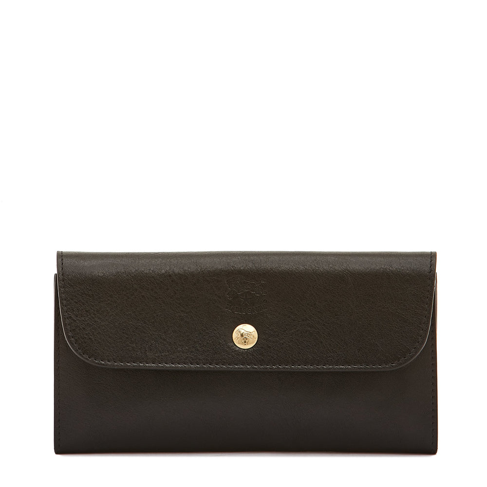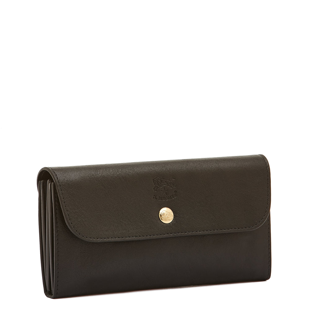 Women's continental wallet in vegetable tanned cowhide leather. Made in Italy by master artisans in Il Bisonte’s 30 km supply chain.Snap button closure. 4 accordion-style open compartments. Raw cut edges. One zippered coin pocket. 12 credit card slots.