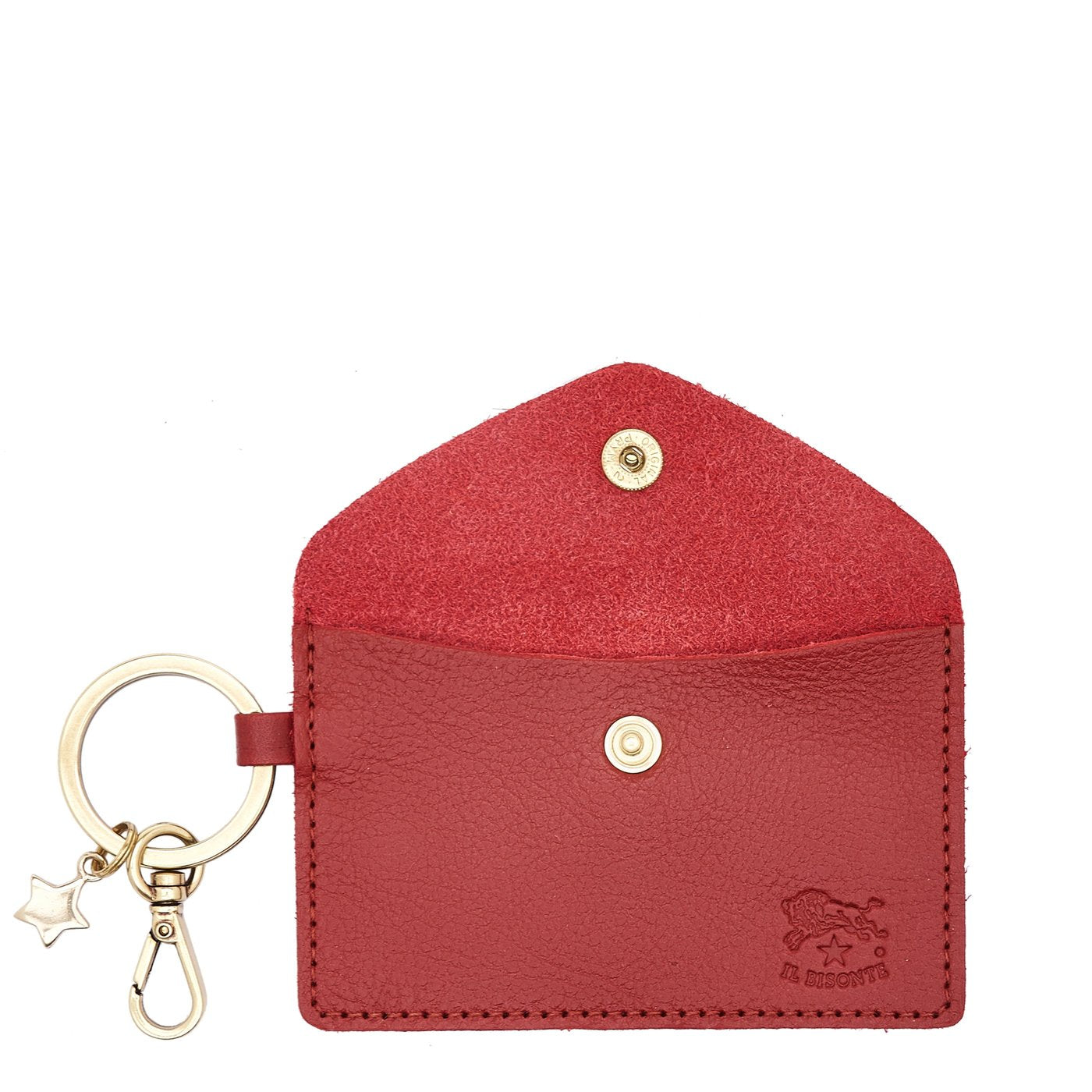 Women's keyring with decorative brass star and card case in vegetable tanned cowhide leather. Made in Italy by master artisans in Il Bisonte's 30 km supply chain. Ring, snap hook and star in gold-finished brass. Leather case with snap button closure and unlined interior.