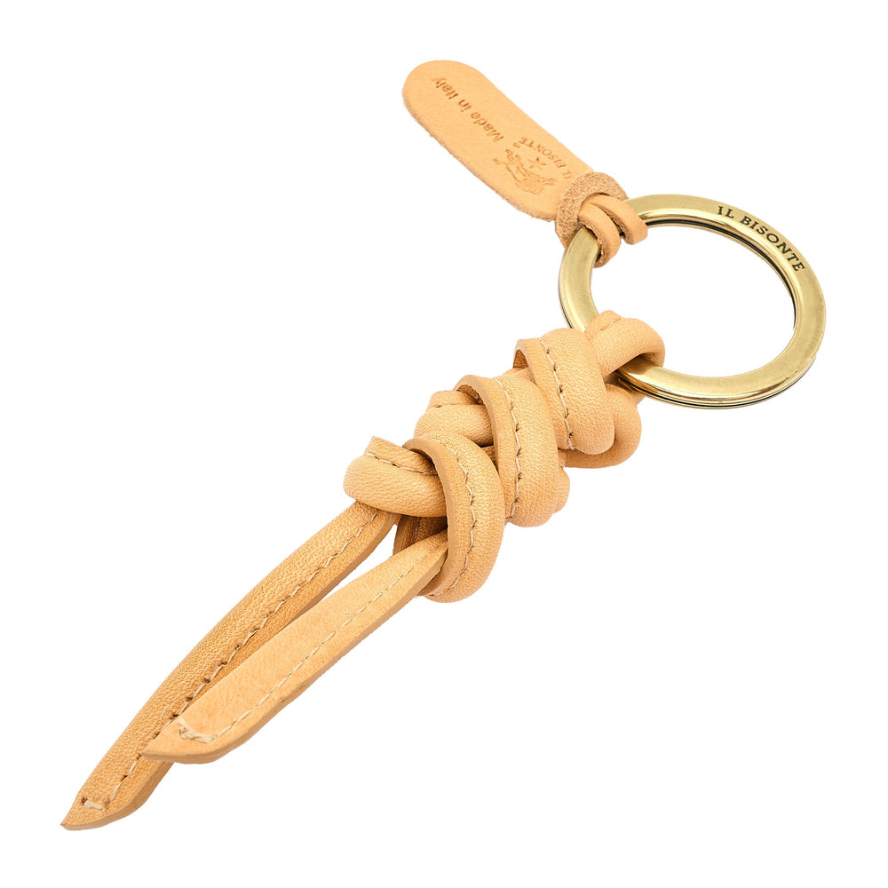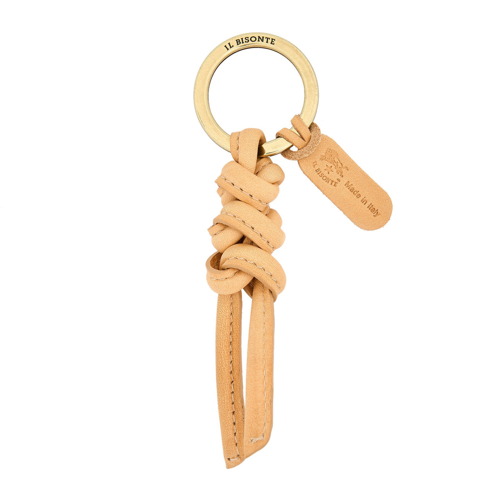 Keyring in vegetable-tanned leather with brass logo ring. Its essential design is distinguished by its unique hand-knotted leather lanyard. 100% made in Italy.