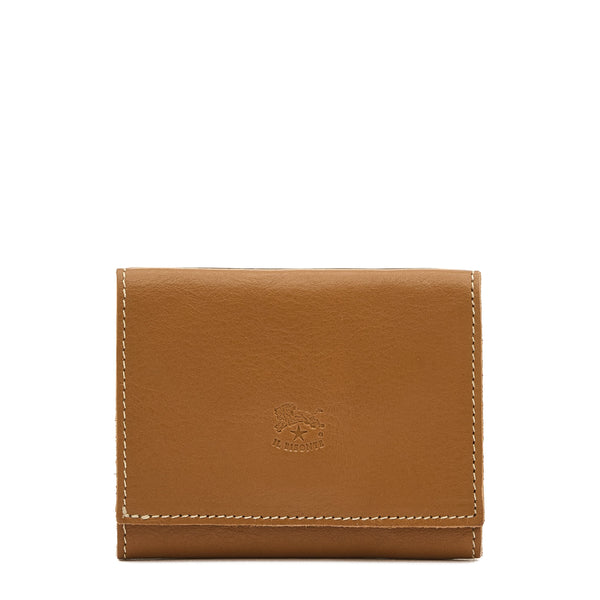 Women's small wallet made of vegetable-tanned leather. Removable outer card holder with zippered coin compartment. The main compartment fastens via an under-flap snap and contains four card pockets and an open compartment for cash. 100% made in Italy.