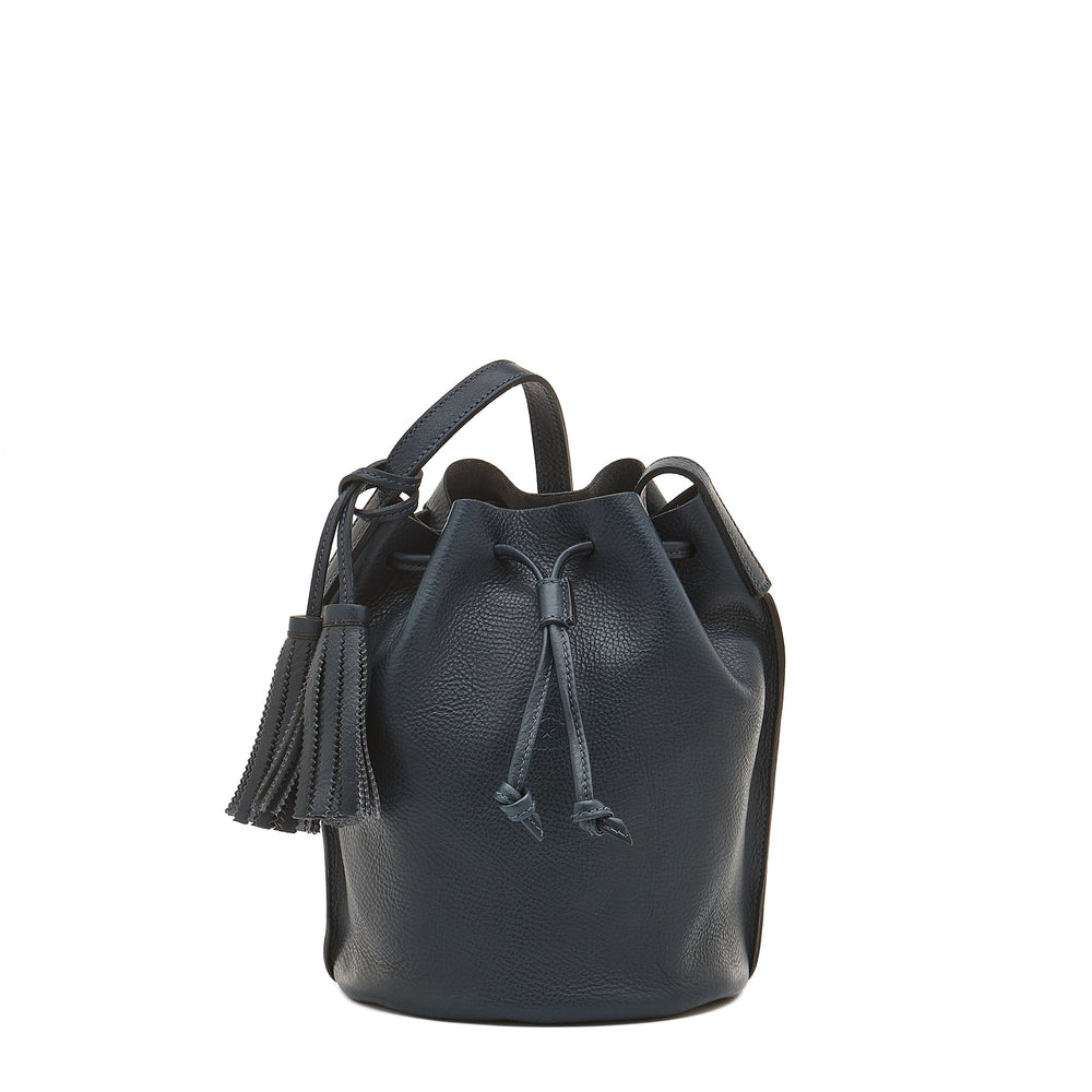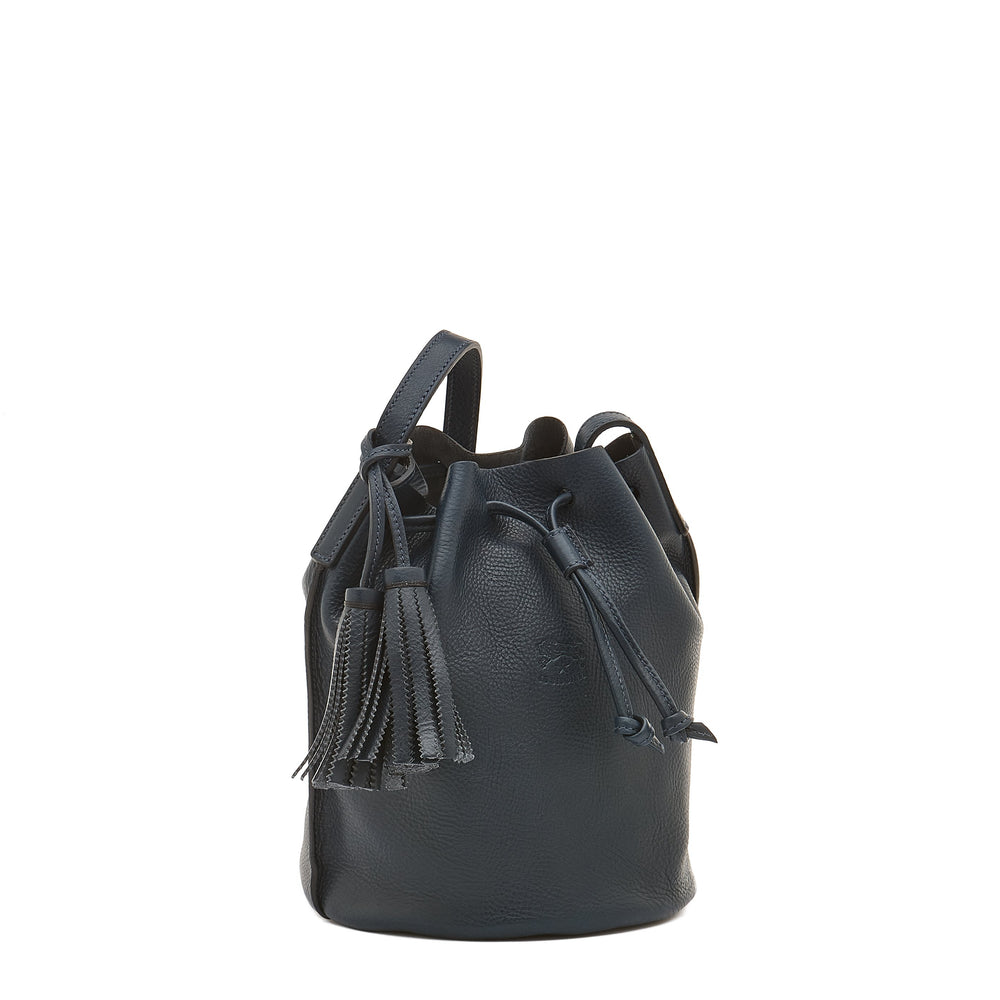 Women's small bucket bag with drawstring closure, adjustable shoulder strap and removable tassels. Made of vegetable tanned cowhide in Italy by master craftsmen in Il Bisonte's 30 km supply chain. Cowhide leather lace with removable tassels in cowhide leather. Unlined.