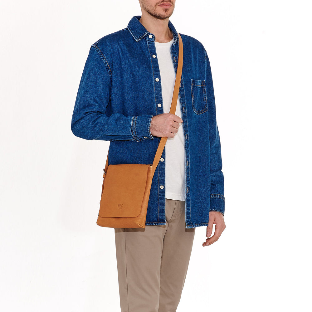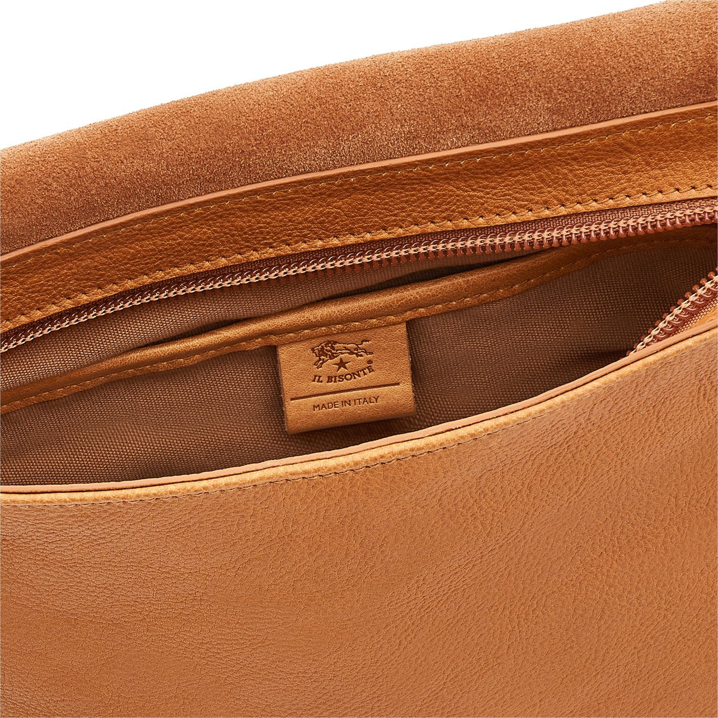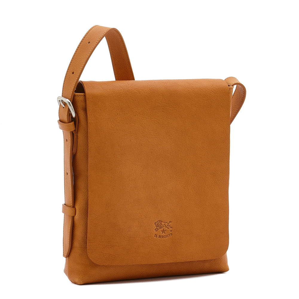 Men's bag wearable over the shoulder or crossbody. Adjustable buckle shoulder strap with side buckle. Flap with rounded edges, lined with suede. Zipper closure. Interior, lined in cotton canvas, includes an open pocket. 100% made in Italy, produced in the province of Florence by the master artisans of Il Bisonte's 30-Km supply chain.