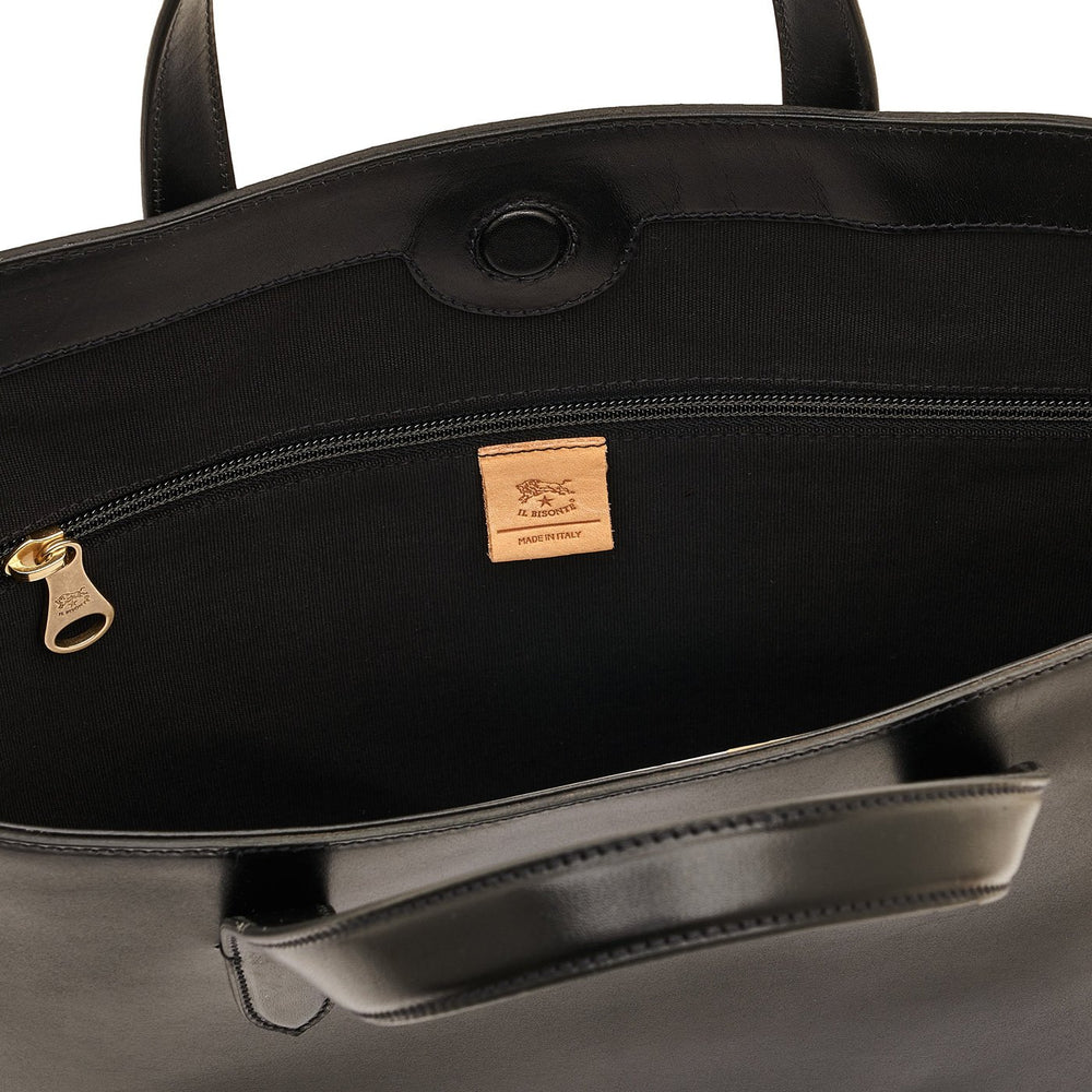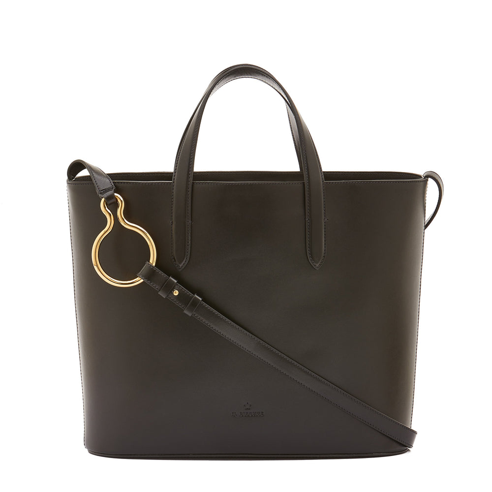 Vegetable-tanned leather handbag featuring an essential design and uniquely iconic metal accessory. It can also be worn crossbody or over the shoulder thanks to the adjustable shoulder strap and stud. Padded handles hand-stitched in place. Leather-covered magnetic snap closure. Inside is lined in cotton canvas and contains a zippered pocket. 100% made in Italy.
