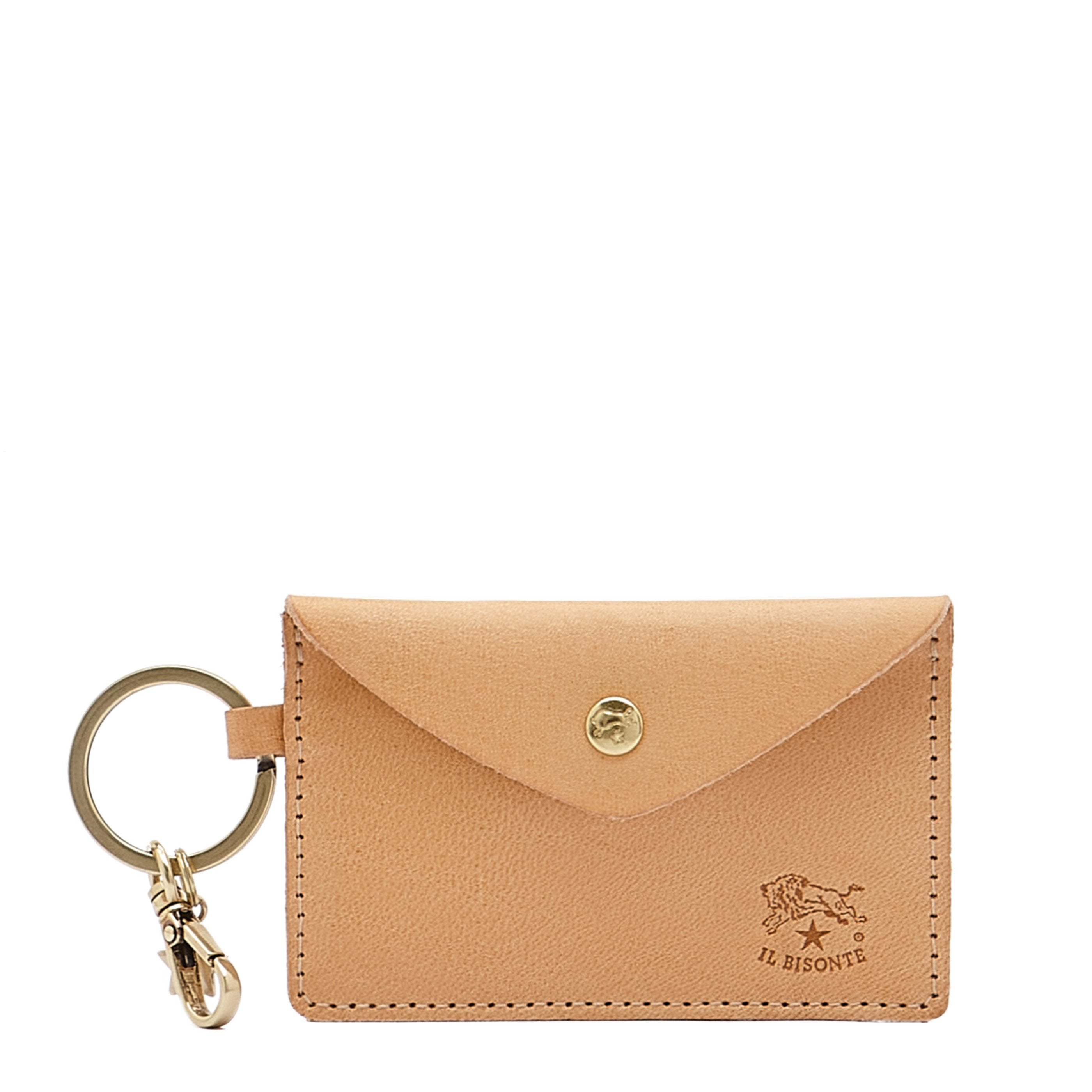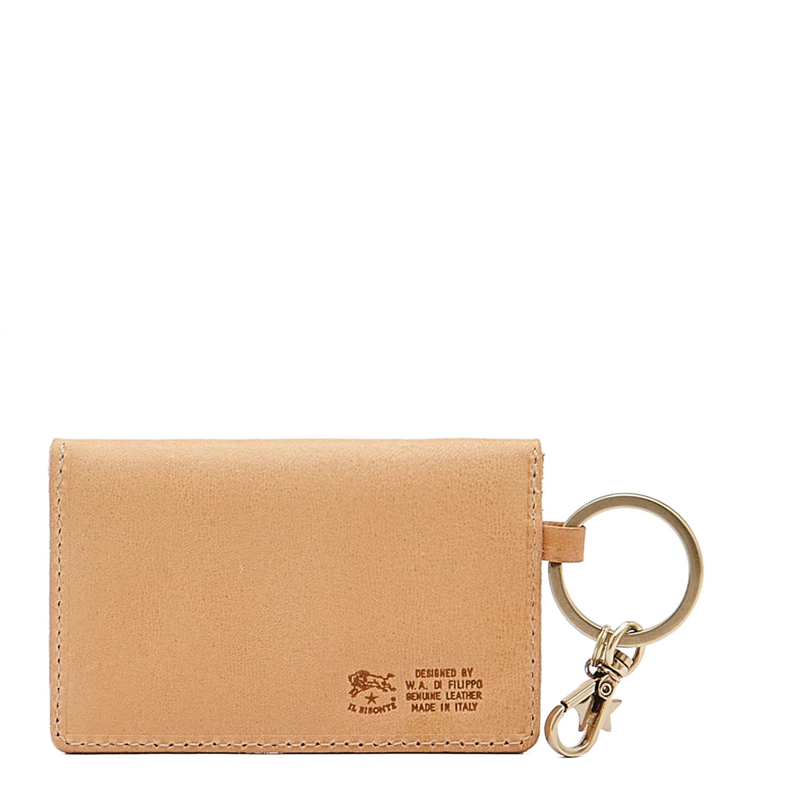 Women's keyring with decorative brass star and card case in vegetable tanned cowhide leather. Made in Italy by master artisans in Il Bisonte's 30 km supply chain. Ring, snap hook and star in gold-finished brass. Leather case with snap button closure and unlined interior.