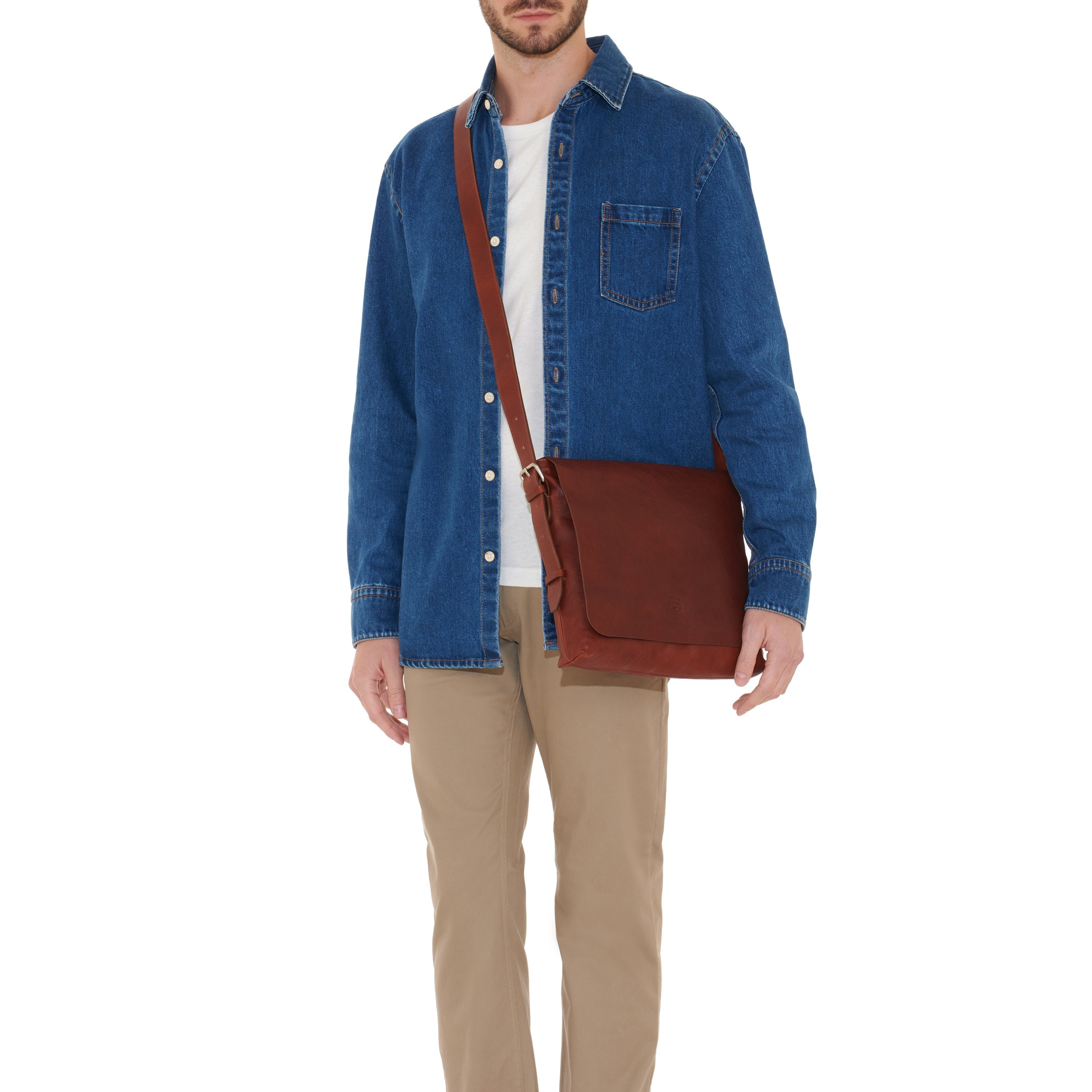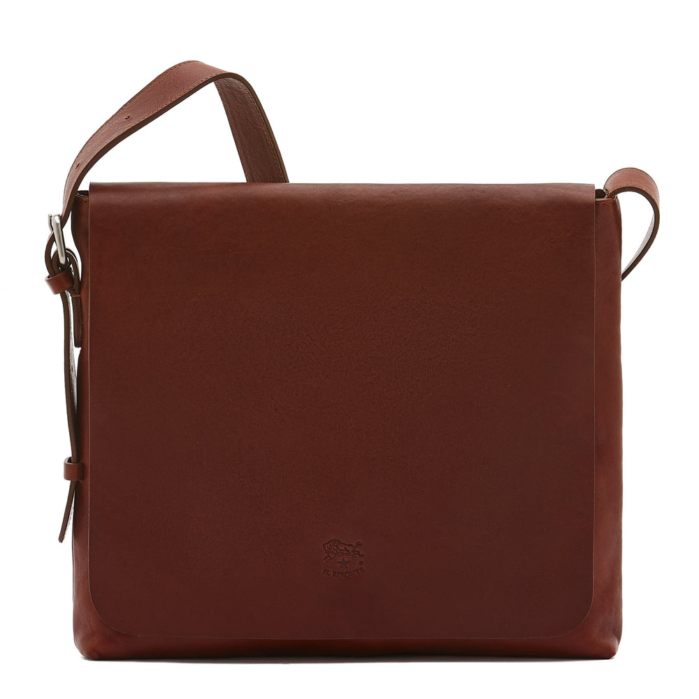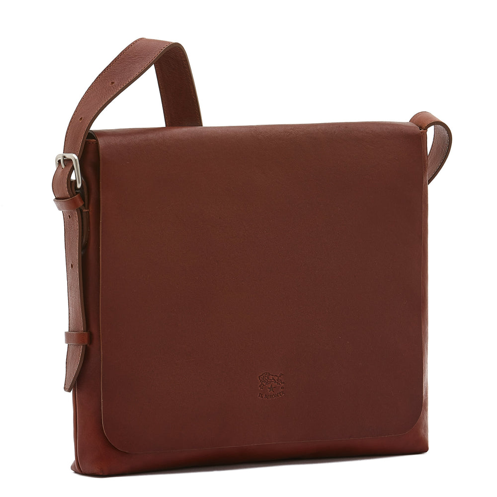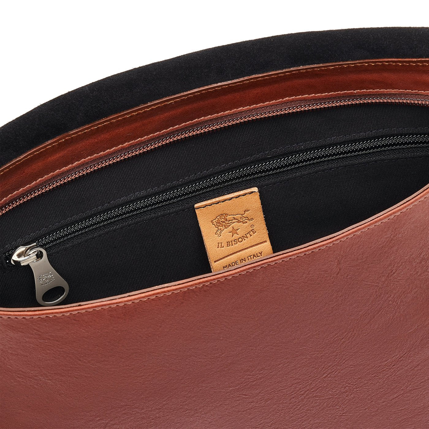 Men's messenger bag with shoulder strap adjustable by buckle on the side. Flap with rounded edges lined with suede. Zipper closure. Interior, lined with cotton canvas, includes one open pocket and one zippered pocket. 100% made in Italy, produced in the province of Florence by the master artisans of Il Bisonte's 30-Km supply chain.
