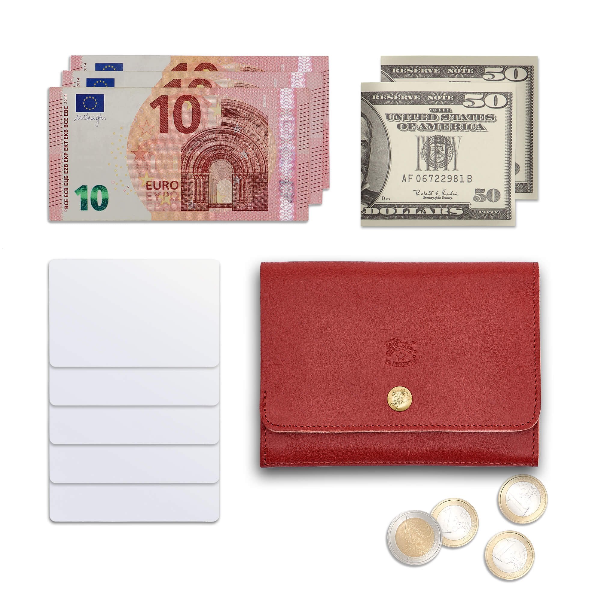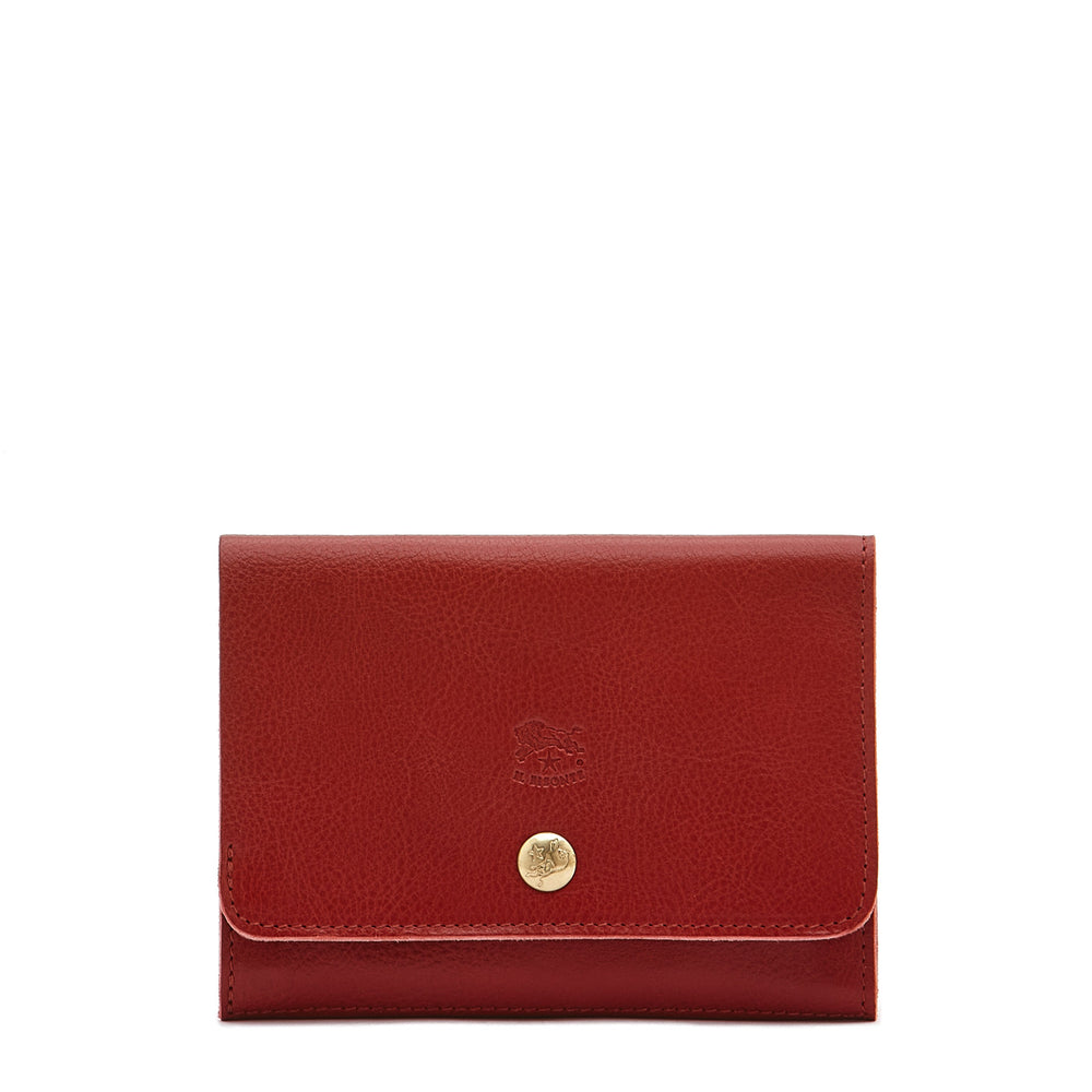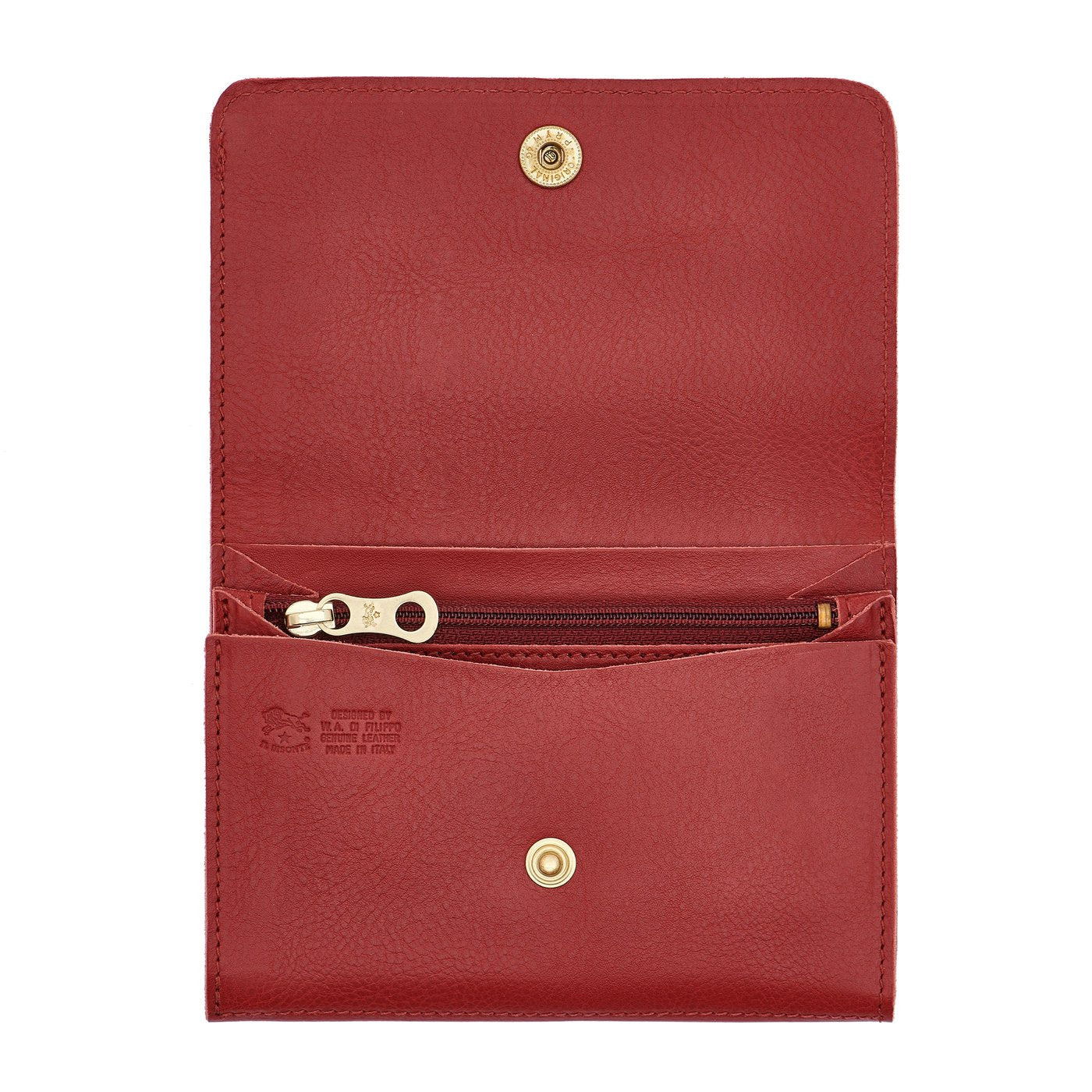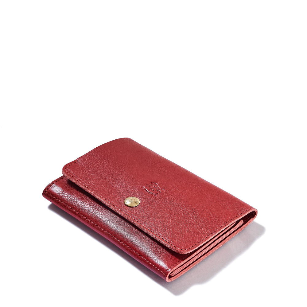 Unisex wallet in vegetable tanned cowhide with compartments for coins, ID and credit cards. Made in Italy by master craftsmen in Il Bisonte's 30 km supply chain. Flap closes with brass snap button. Inside 4 credit card slots, 3 pockets for documents, 1 zippered coin pocket with brass zipper pull and a banknote compartment.