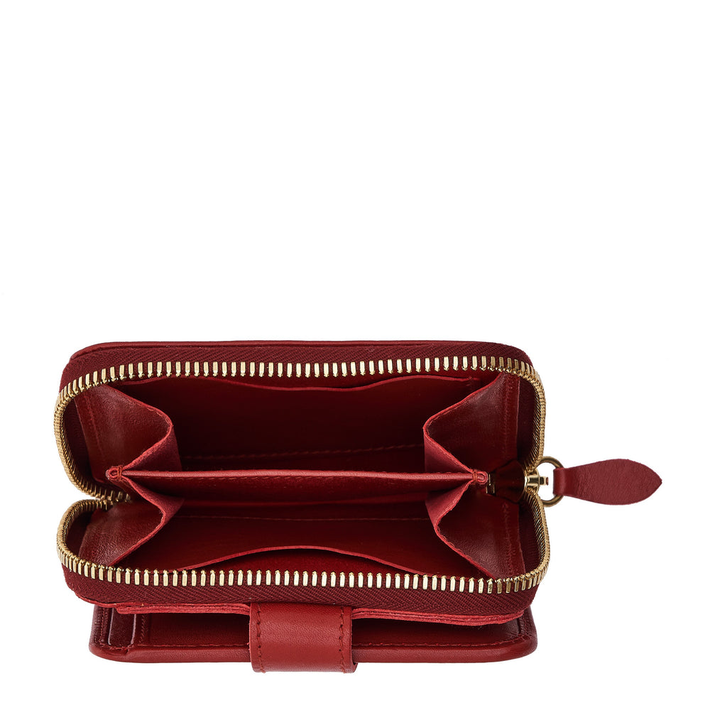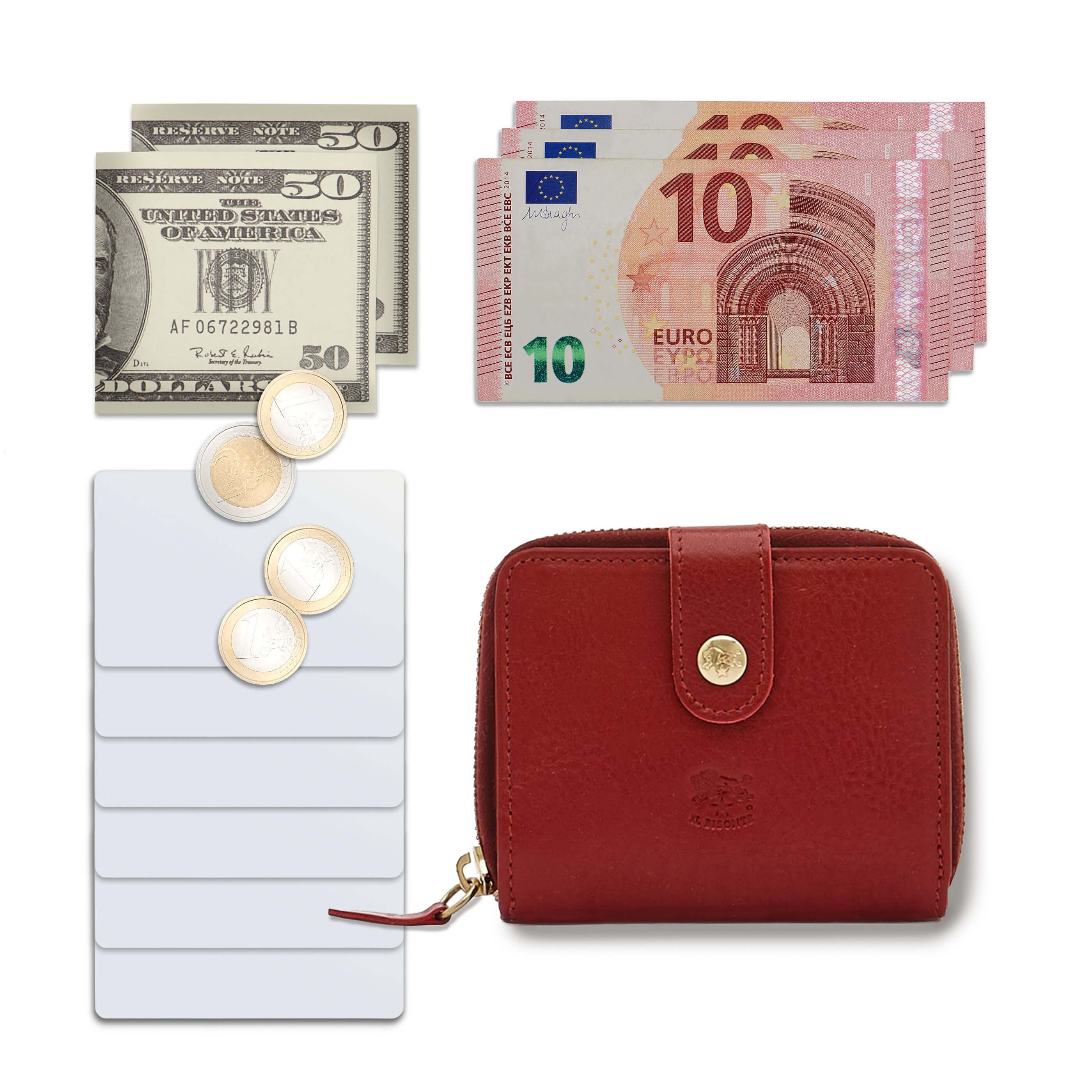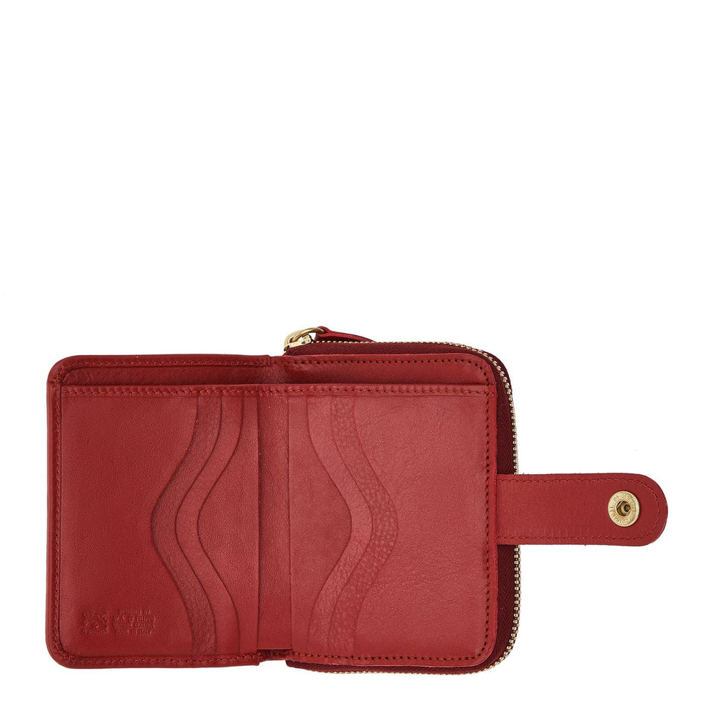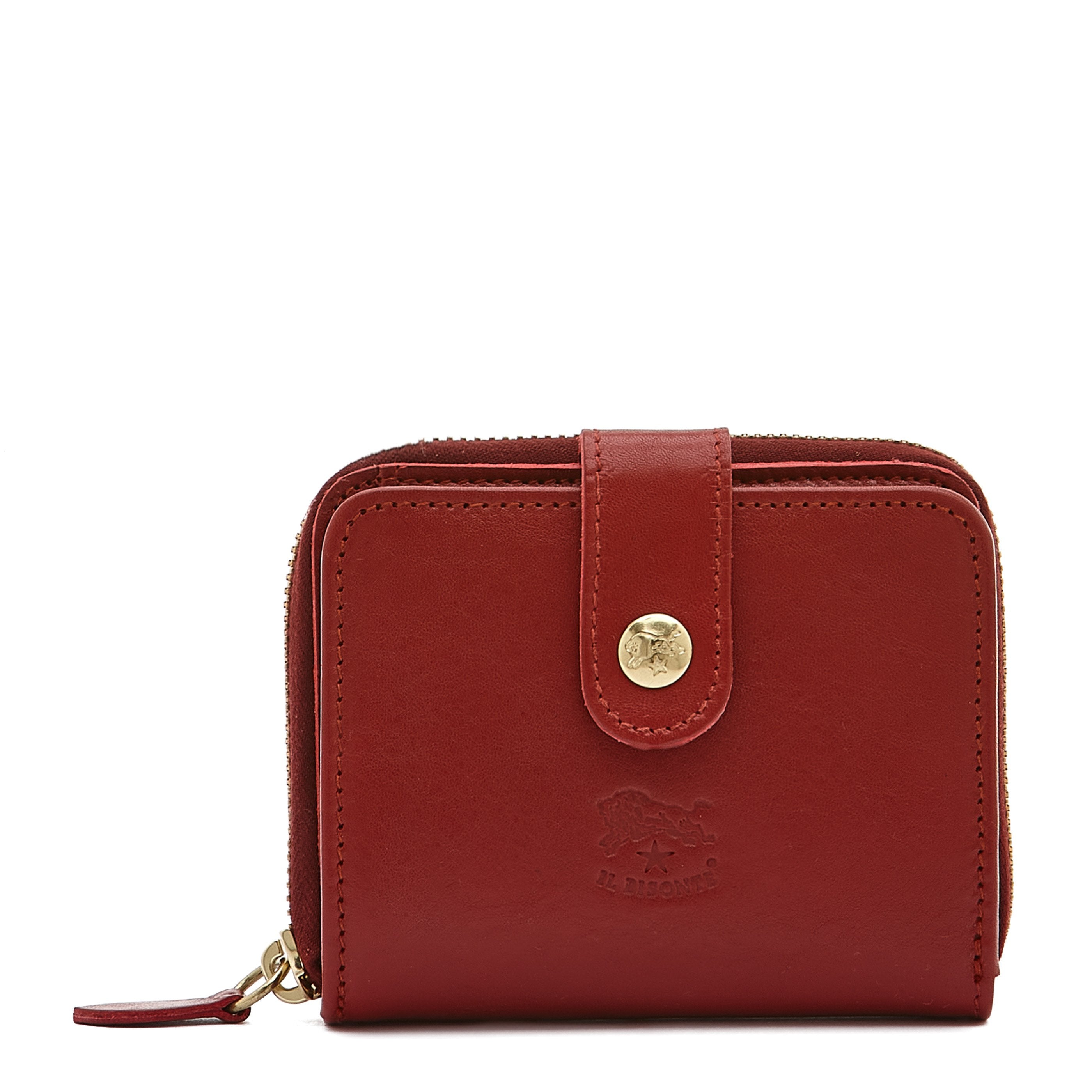 Compact women's wallet in vegetable tanned cowhide with coin pocket and compartments for banknotes and credit cards. Made in Italy by master craftsmen in Il Bisonte's 30 km supply chain. Brass snap button closure. Large back zippered pocket lined with cotton canvas, with divided compartment for coins and cards. Inside compartment for banknotes and 8 credit card slots.