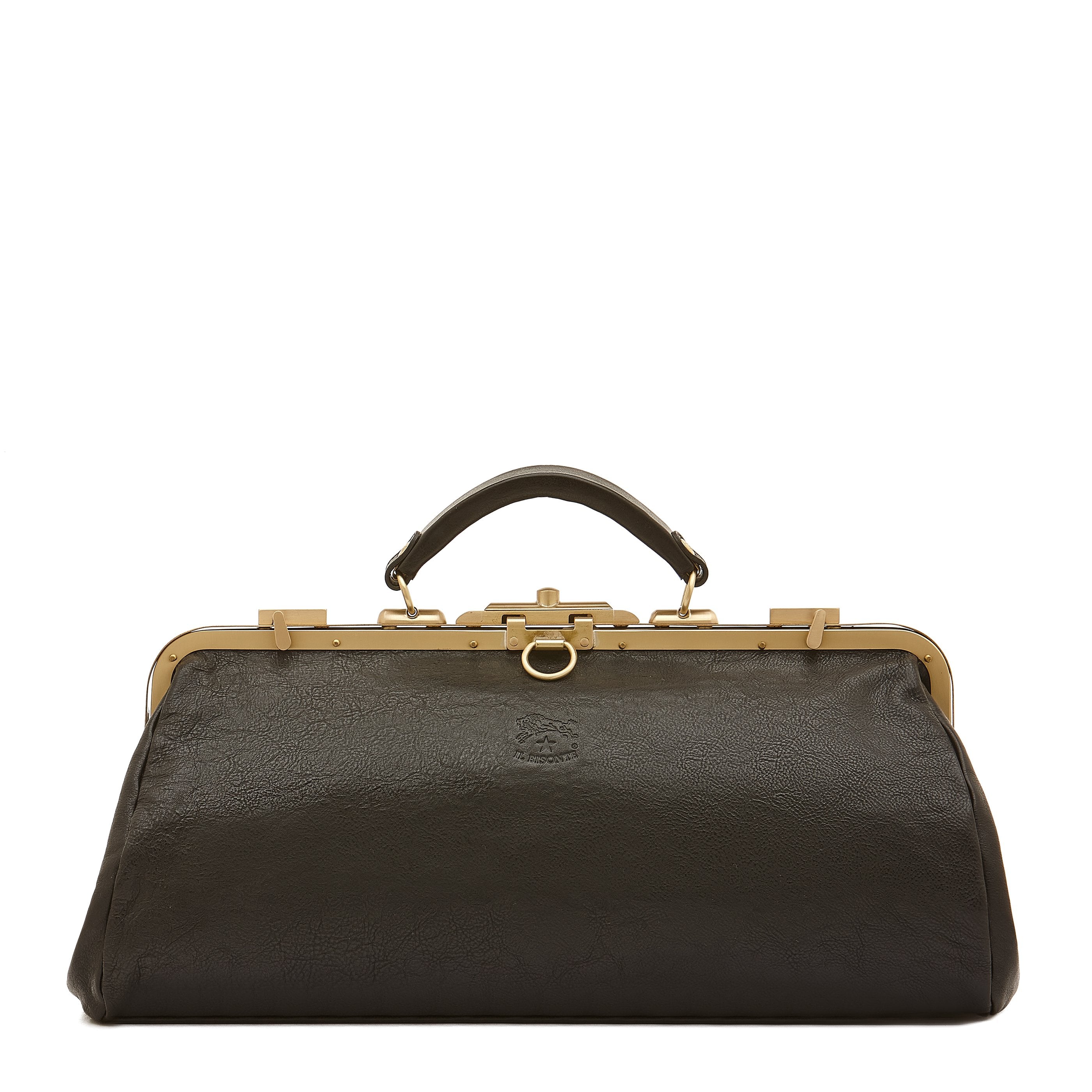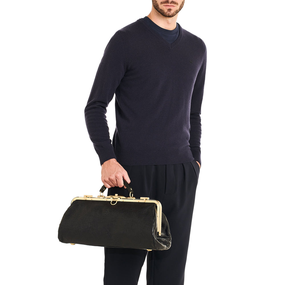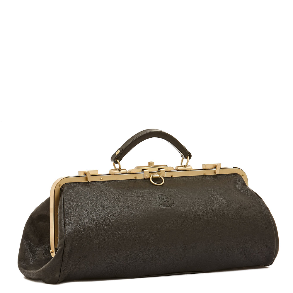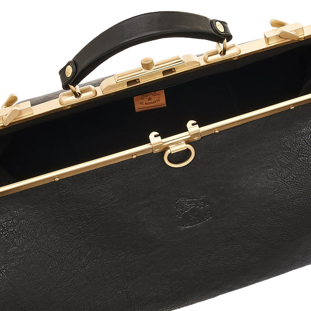 Sac à main pour homme avec poignée renforcée et fermoir à levier en laiton. Son design rétro est inspiré des mallettes médicales traditionnelles. Réalisé en cuir de vachette à tannage végétal, il est produit en Italie par les maîtres artisans du circuit court de 30 km de Il Bisonte. L'intérieur, doublé en toile de coton, abrite 6 poches ouvertes avec passepoil en cuir de vachette. Sur le dessous, des patins de sac en laiton.