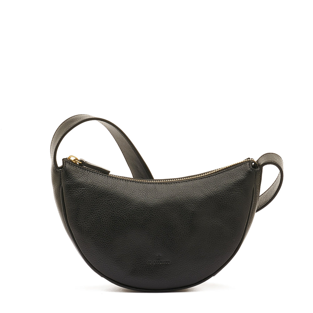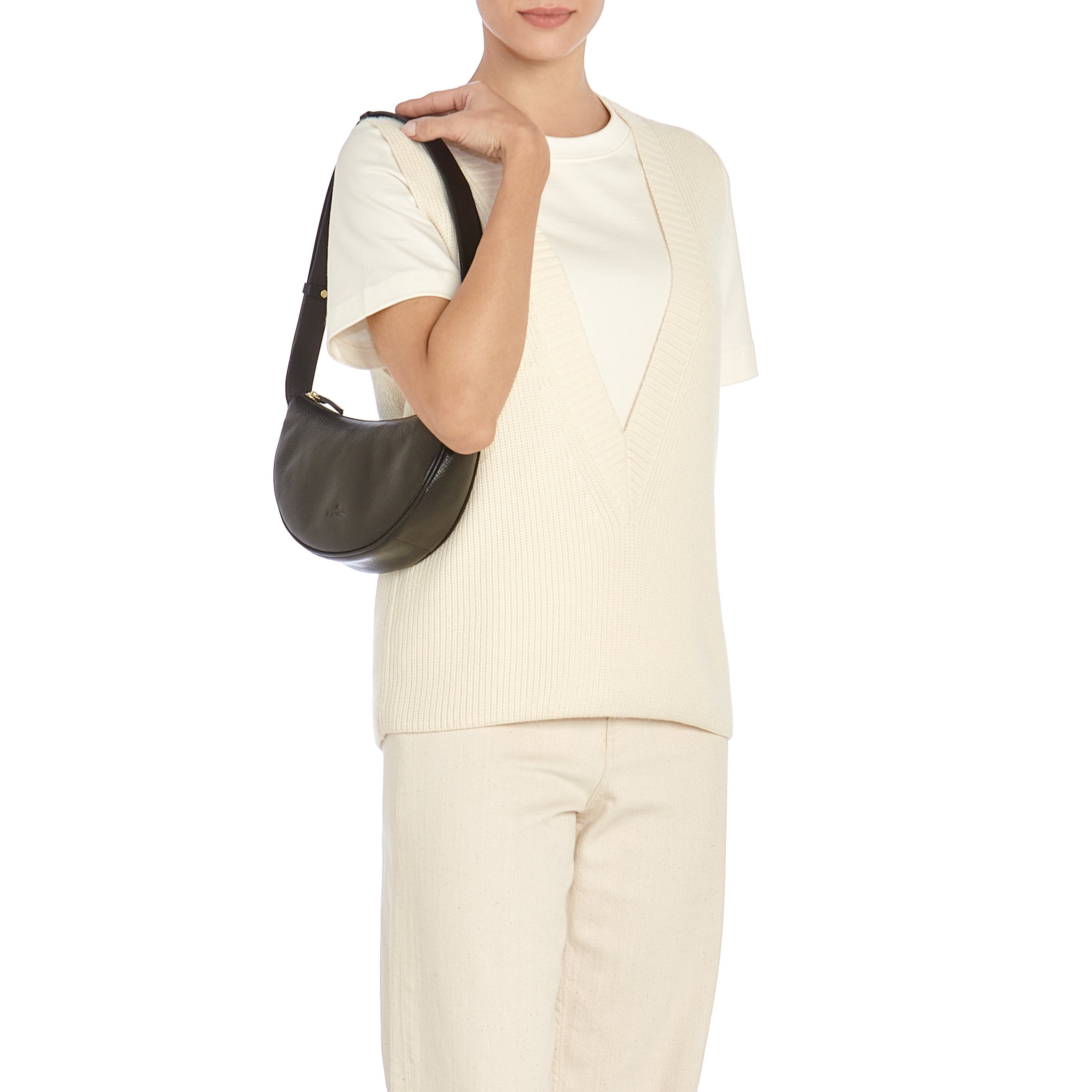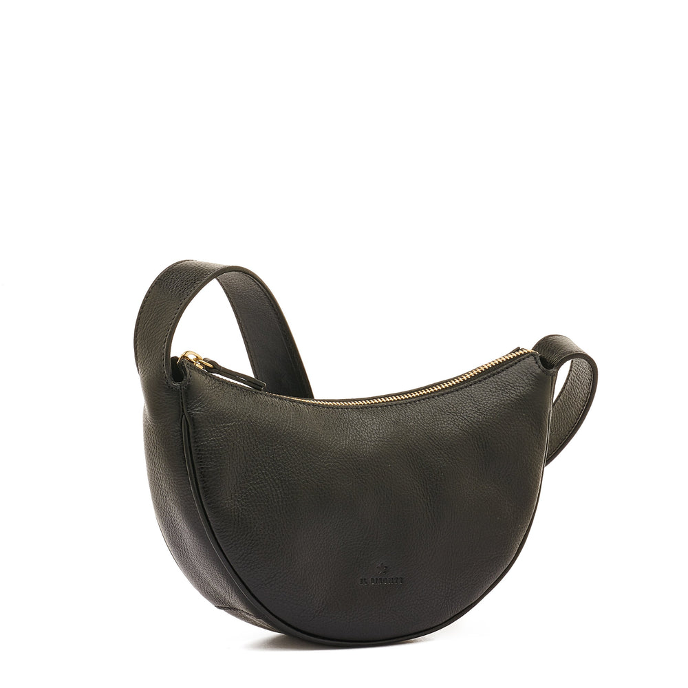 Sac hobo en cuir à tannage végétal. Se porte en bandoulière ou sur l'épaule. La bandoulière, particulièrement confortable, suit le profil du sac et se règle à l'aide d'un bouton de col à vis. Fermeture zippée avec tirette en cuir fixée à l'aide de coutures réalisées à la main. Intérieur doublé en toile de coton, avec une poche. 100% made in Italy.