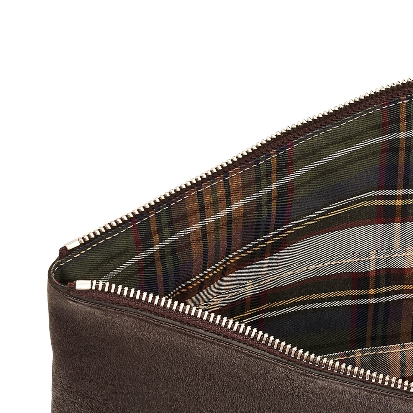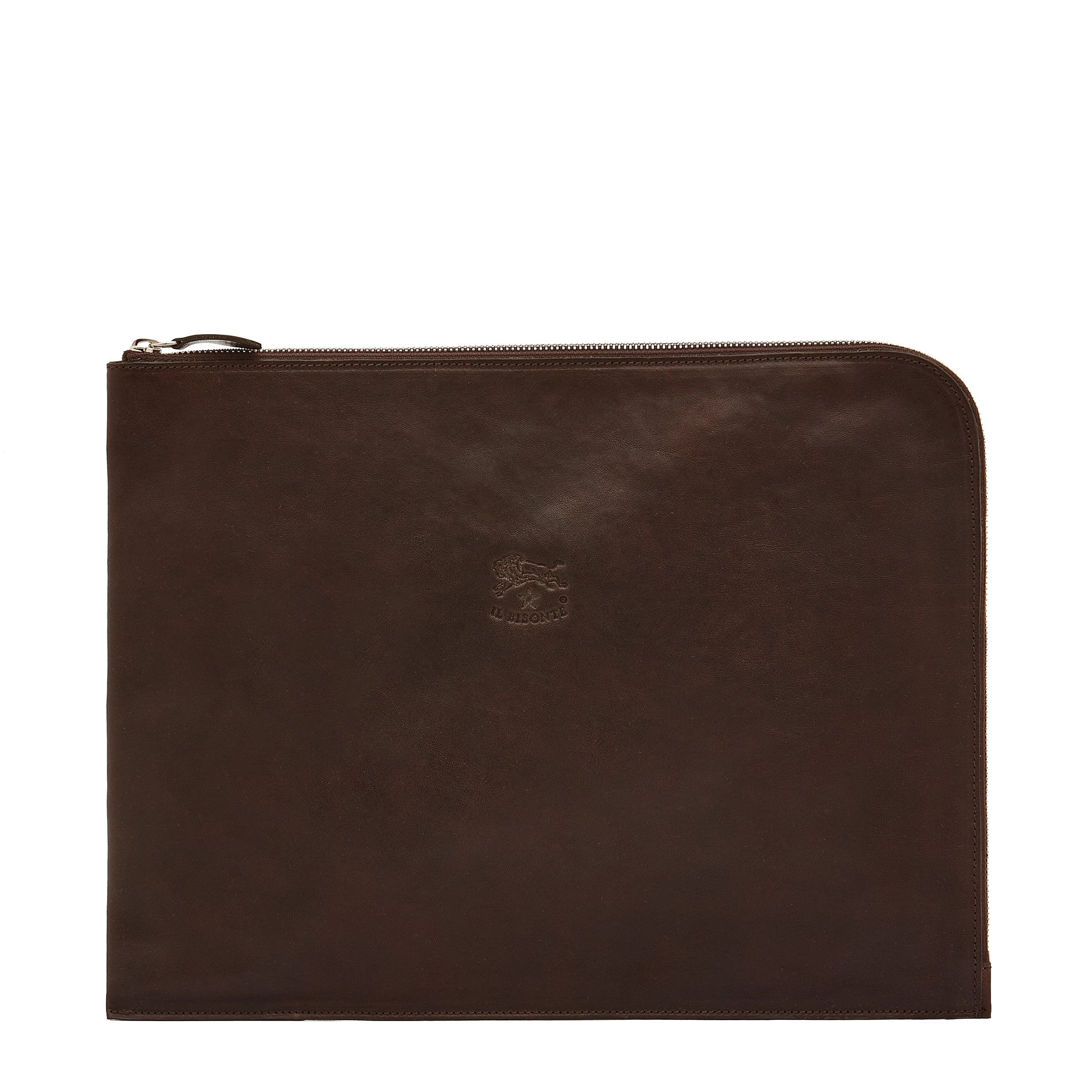Porte-documents en cuir de vachette à tannage végétal avec fermeture éclair et doublure imperméable. Fabriqué en Italie par les maîtres artisans du circuit court à 30 km de Il Bisonte. Fermeture par zip des deux côtés. Tirette en laiton doré et cuir de vachette. L'intérieur, doublé en toile imperméable écossaise, abrite 2 grandes poches ouvertes et 4 petites poches en tissu.
