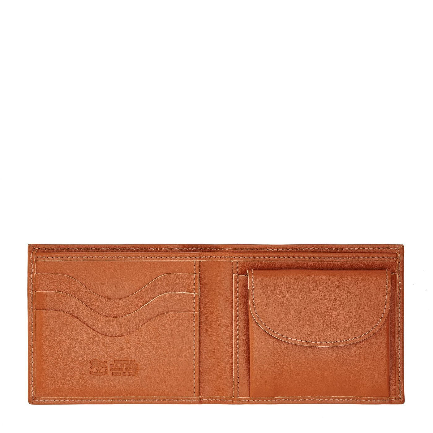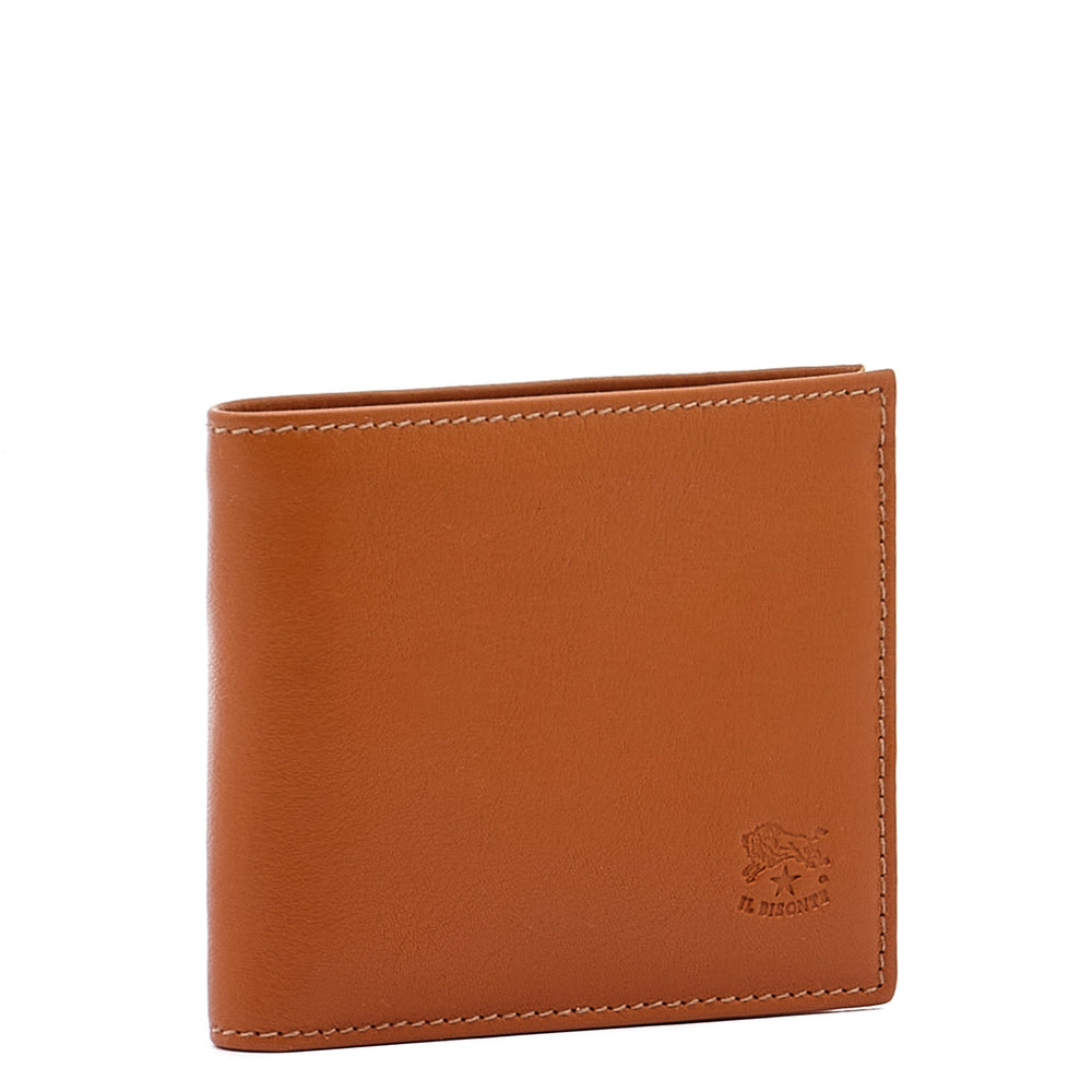 Portefeuille à deux volets pour homme en cuir de vachette à tannage végétal, avec poches pour billets, cartes de crédit et docunents. Produit en Italie par les maîtres artisans de la filière à km 30 de Il Bisonte.A l'intérieur, un grand compartiment non doublé pour billets, 3 poches pour cartes et 1 poche porte-docunents en cuir de vachette avec fermeture à bouton pression caché.