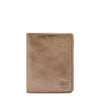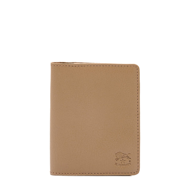 Porte-cartes et docunents avec ouverture à livre en cuir de vachette à tannage végétal. Produit en Italie par les maîtres artisans de la filière à km 30 de Il Bisonte.L'intérieur, non doublé, contient 2 poches porte-cartes de crédit et une poche porte-docunents et pass.