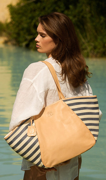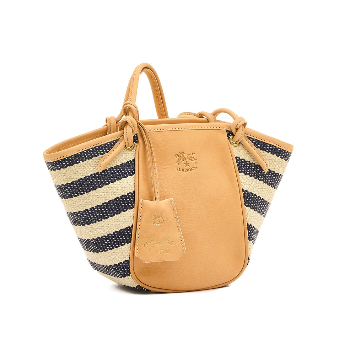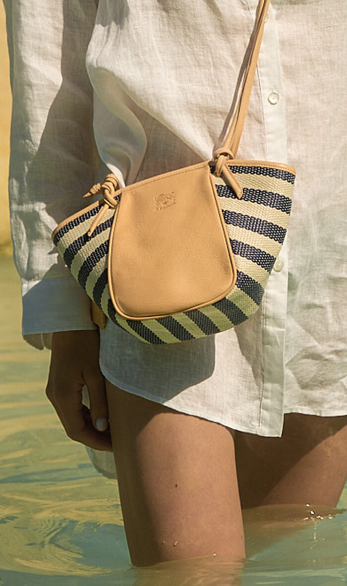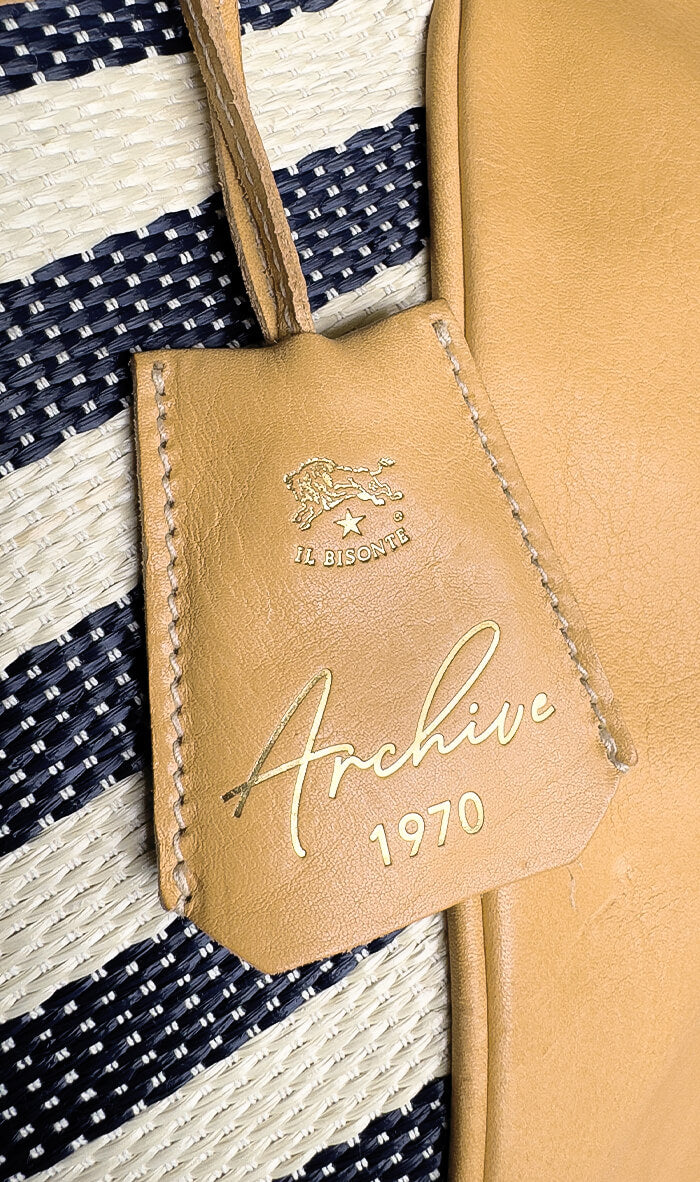 Cuir à tannage végétal, raphia et toile de coton rayée : la ligne 1970 rend hommage à la tradition la plus authentique de IL BISONTE jusque dans le choix des matières premières.