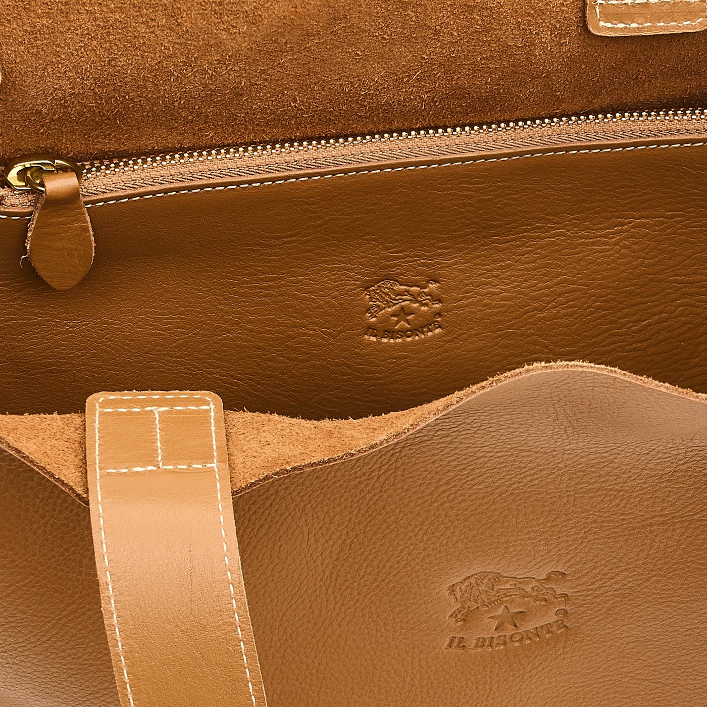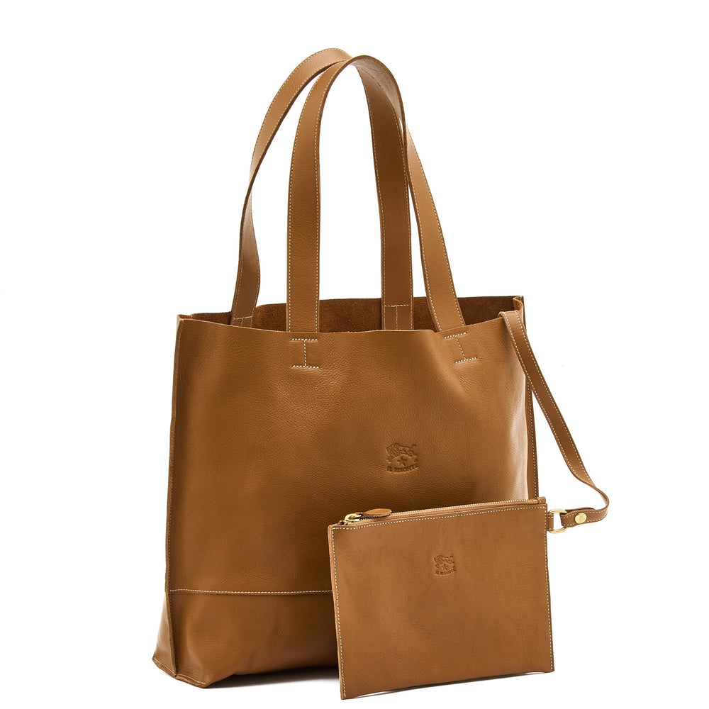 Sac fourre-tout pour femme avec pochette intérieure amovible. Réalisé en cuir de vachette à tannage végétal, il est produit en Italie par les maîtres artisans de la filière à km 30 de Il Bisonte.L'intérieur, doublé et avec fond en suède, contient un pratique anneau porte-clés et une pochette en cuir de vachette avec fermeture zippée.