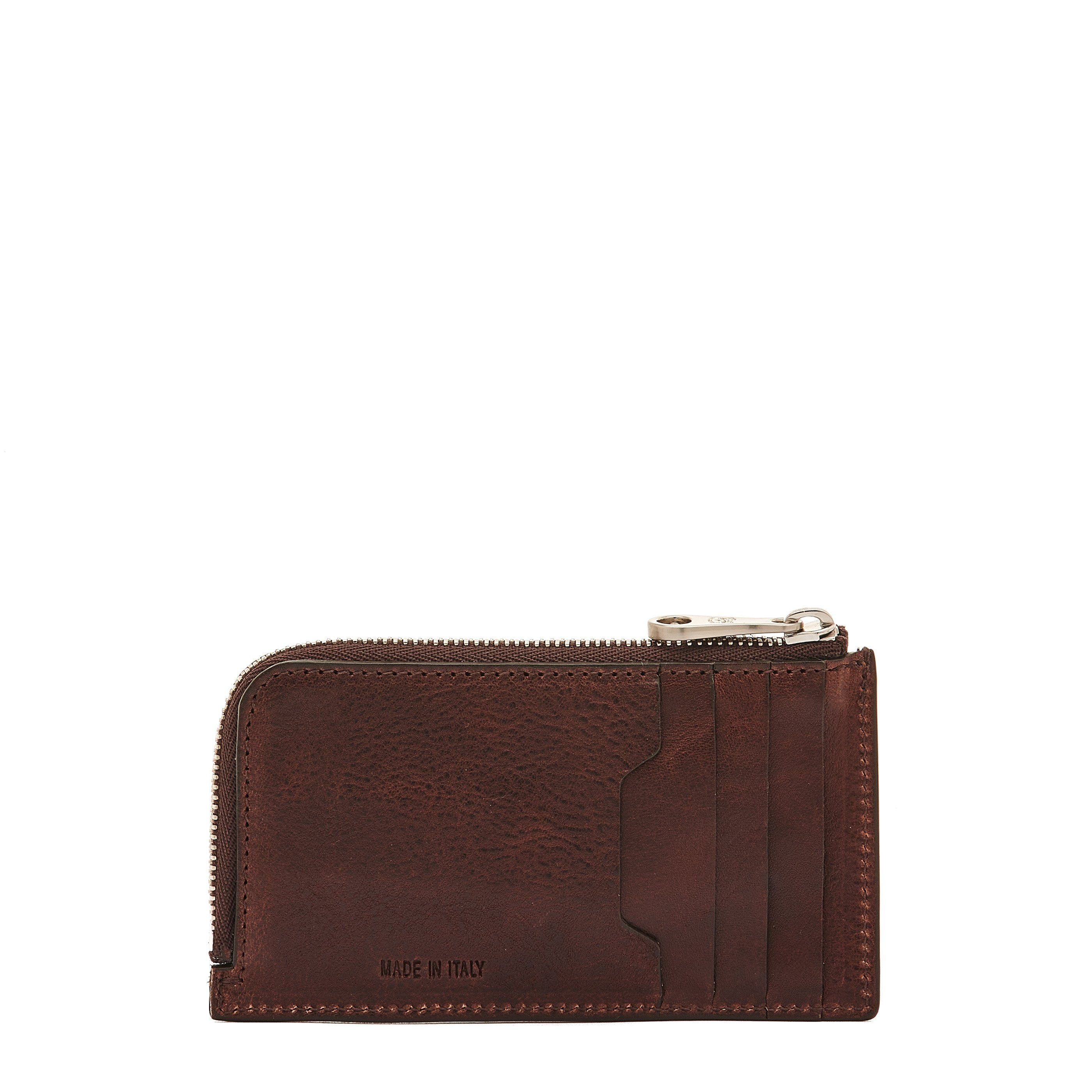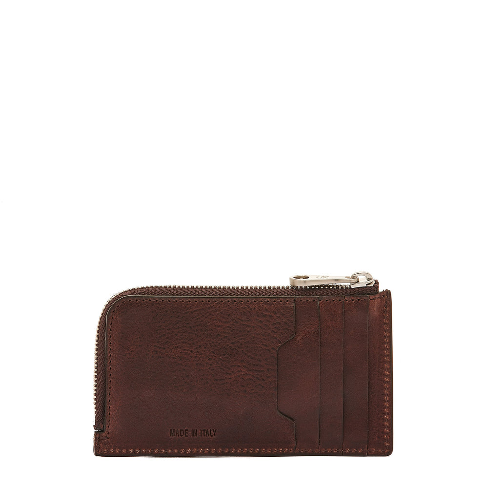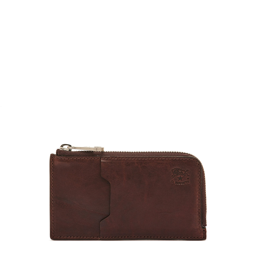Porte-cartes pour homme au design épuré qui sublime la beauté naturelle des cuirs à tannage végétal. Cinq petites poches extérieures pour les cartes à l'iconique profil géométrique. Intérieur doublé en toile de coton avec compartiment pour les billets et les pièces de monnaie. Fermeture zippée. 100% made in Italy.