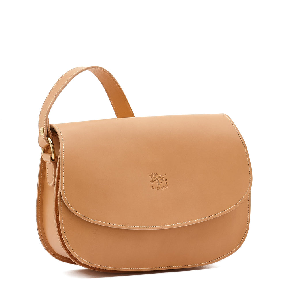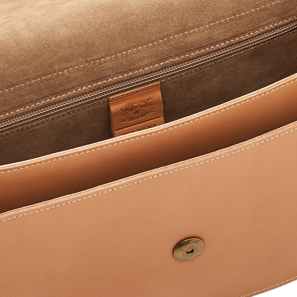 Sac bandoulière pour femme en cuir de vachette à tannage végétal, avec rabat à fermeture magnétique. Produit en Italie par les maîtres artisans de la filière à km 30 de Il Bisonte. Bandoulière réglable. Sous rabat en suède. L'intérieur, non doublé, contient deux grands compartiments et une poche en suède avec fermeture zippée et tirette en laiton.