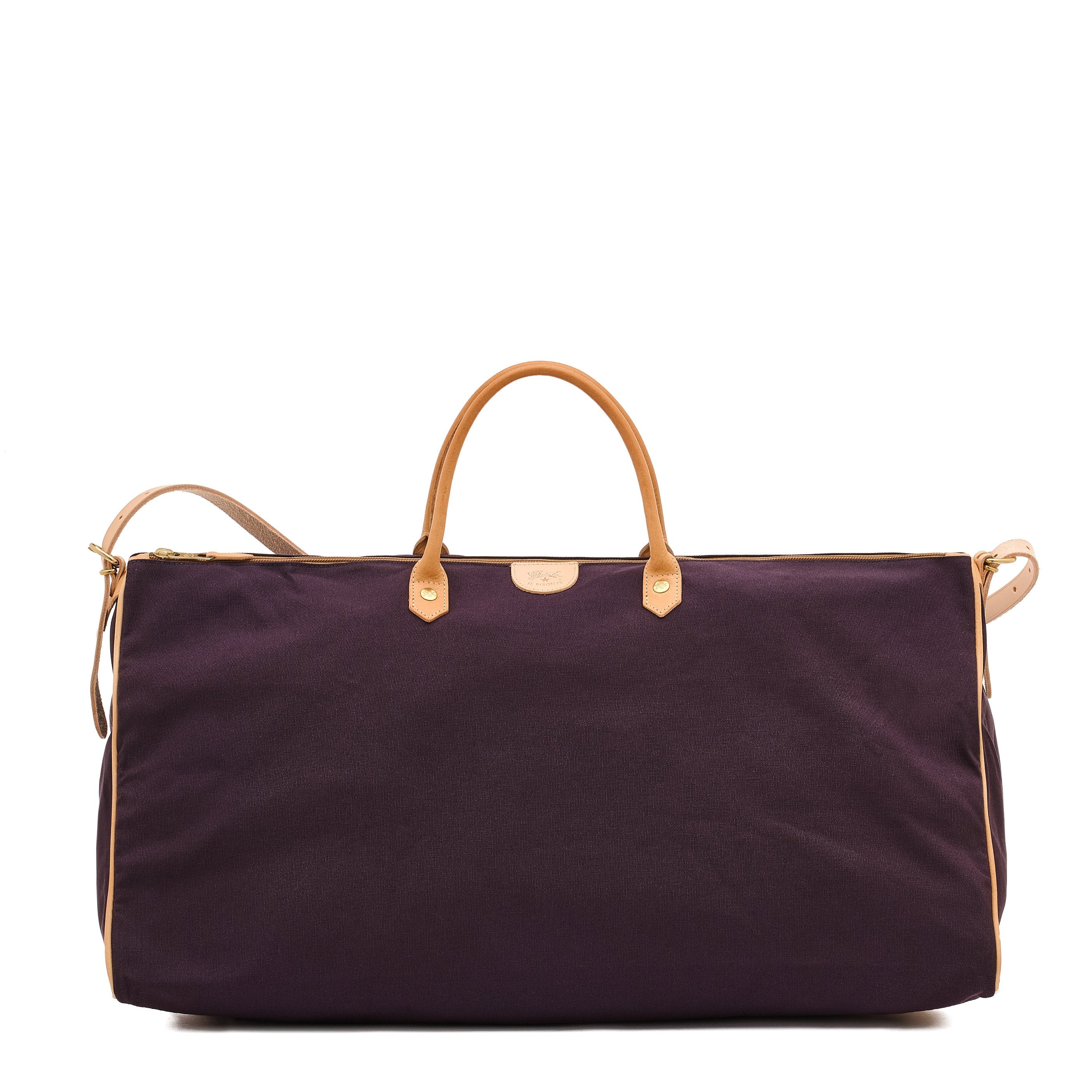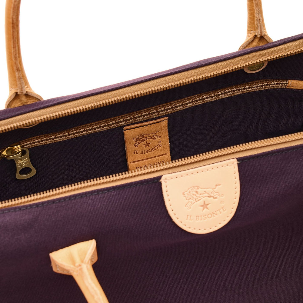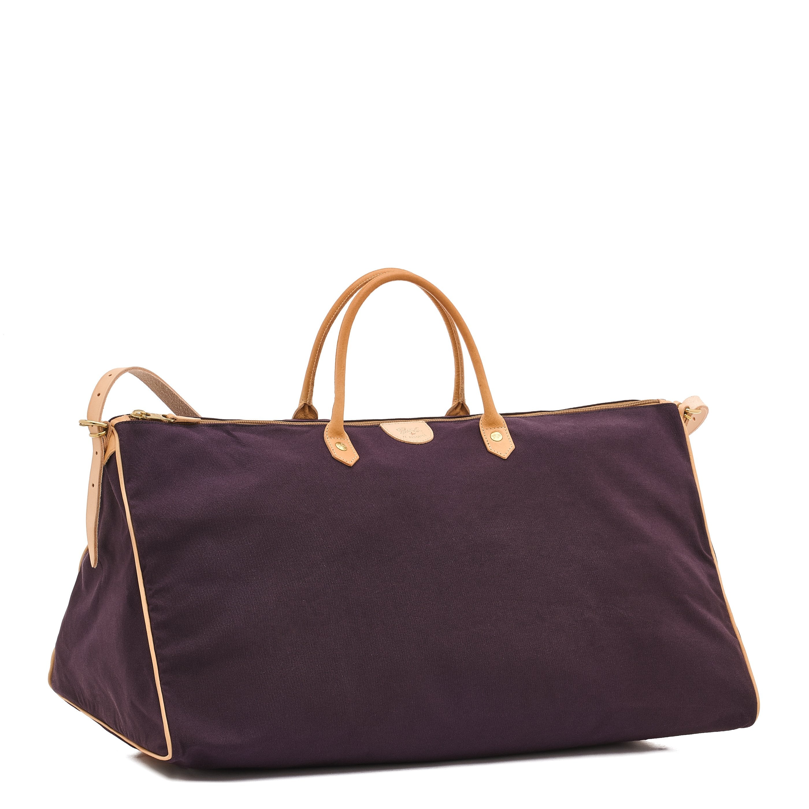 Sac de voyage en polycoton résistant et cuir de vachette à tannage végétal. Confortable, extrêmement léger et spacieux, si nécessaire il peut être enroulé sur lui-même et compacté de façon à être rangé facilement. Dessiné par Wanny Di Filippo en 1976, il est produit en Italie par les maîtres artisans de la filière à km 30 de Il Bisonte.Double poignée et bandoulière réglables avec boucles en laiton. Le sac se compacte en se roulant sur la bande de cuir avec bouton pression placée sur le fond. Fermeture zippée avec tirette en laiton et cuir de vachette. L'intérieur, doublé en coton, contient une poche zippée.