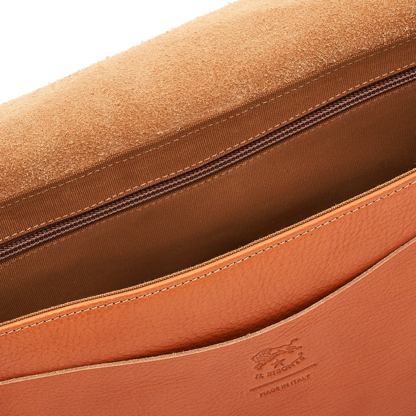 Sac pour femme en cuir de vachette volonato souple à tannage végétal, à porter sur l'épaule ou en bandoulière. 100% made in Italy, il est produit en Toscane, dans la province de Florence, par les maîtres artisans du circuit court de 30 km de Il Bisonte. Bandoulière réglable à l'aide d'une boucle. Rabat frontal avec fermeture par bouton pression magnétique invisible. Poche ouverte sous le rabat avec motif iconique en forme de vague. Poche postérieure avec bouton. Intérieur doublé en toile de coton. Poche intérieure zippée. Les sacs et les accessoires de Il Bisonte sont conçus pour durer très longtemps en gardant leur beauté et leur caractère unique. Pour prendre soin du cuir de vachette, vous pouvez acheter le kit de crème naturelle à base de calendula.