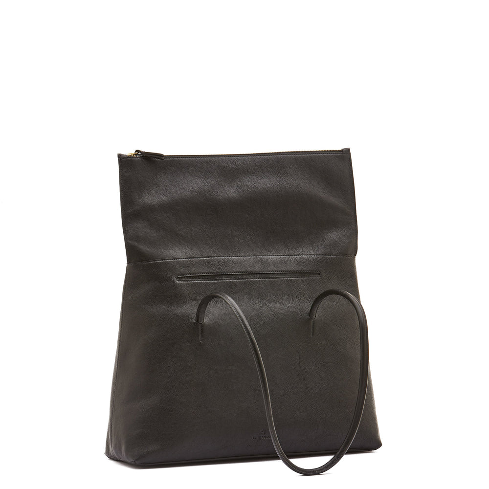 Sac fourre-tout en cuir vintage à tannage végétal. Son design épuré est rendu unique par le rabat qui retombe sur le corps du sac. Fermeture zippée avec tirette en cuir. Ample poche ouverte sous le rabat, doublée en toile de coton. L'intérieur, doublé en toile de coton, est doté d'une poche zippée. 100% made in Italy.