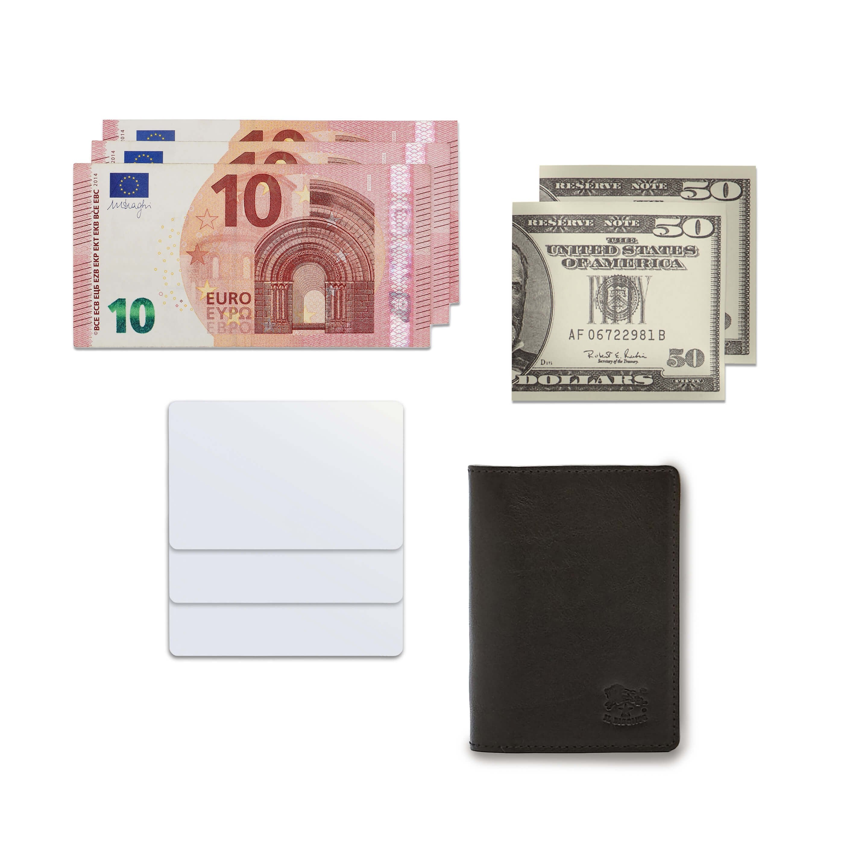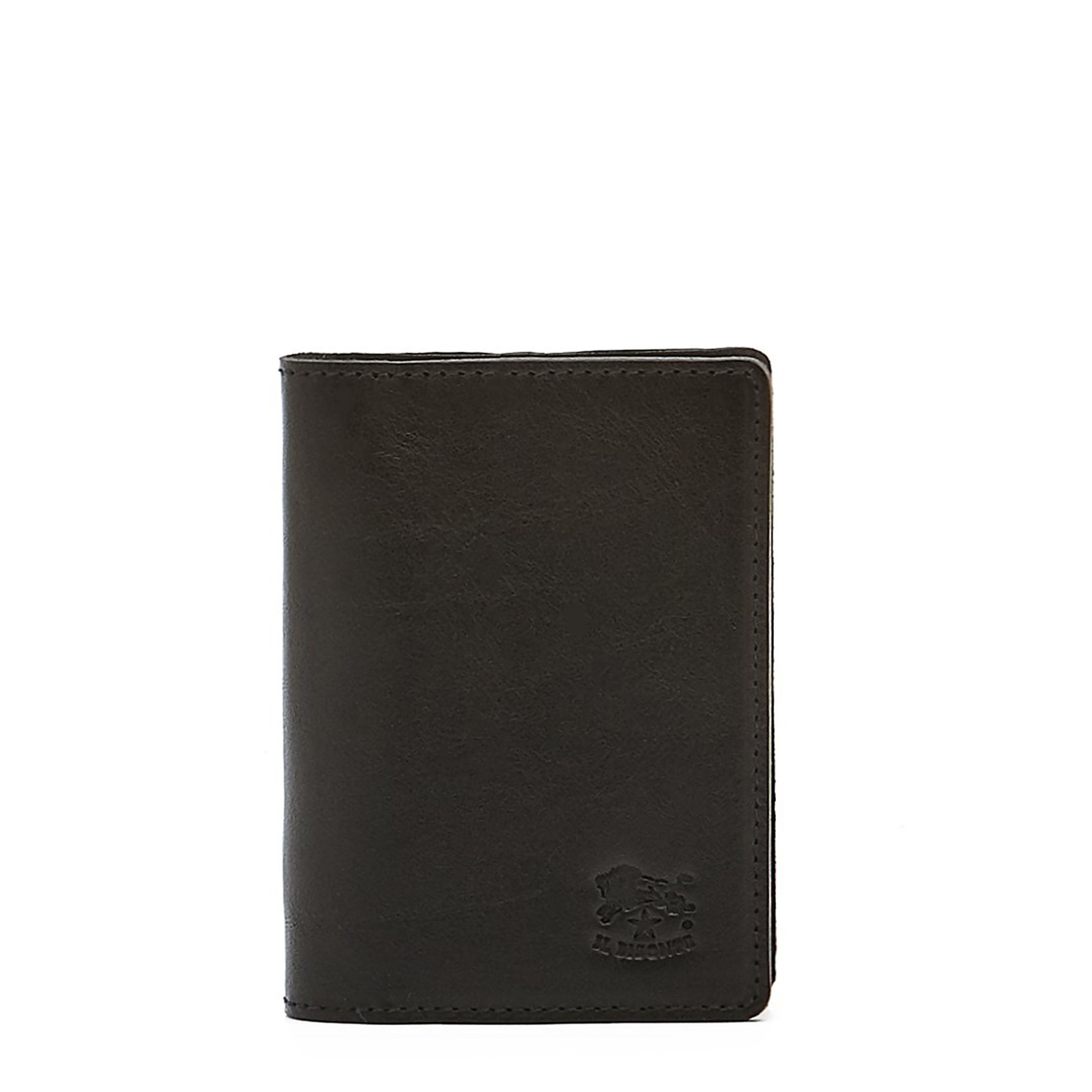 Porte-cartes et docunents avec ouverture à livre en cuir de vachette à tannage végétal. Produit en Italie par les maîtres artisans de la filière à km 30 de Il Bisonte.L'intérieur, non doublé, contient 2 poches porte-cartes de crédit et une poche porte-docunents et pass.