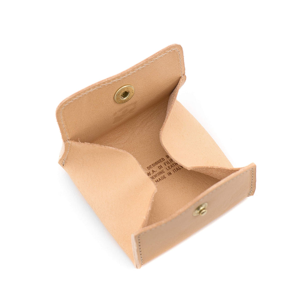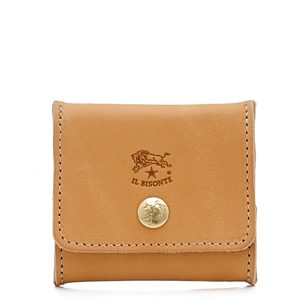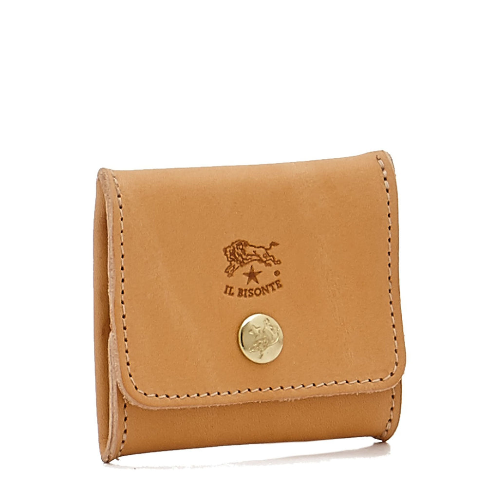 Porte-monnaie unisexe en cuir de vachette à tannage végétal. Produit en Italie par les maîtres artisans de la filière à km 30 de Il Bisonte.Grande ouverture. Fermeture à bouton pression en laiton. Bords francs.