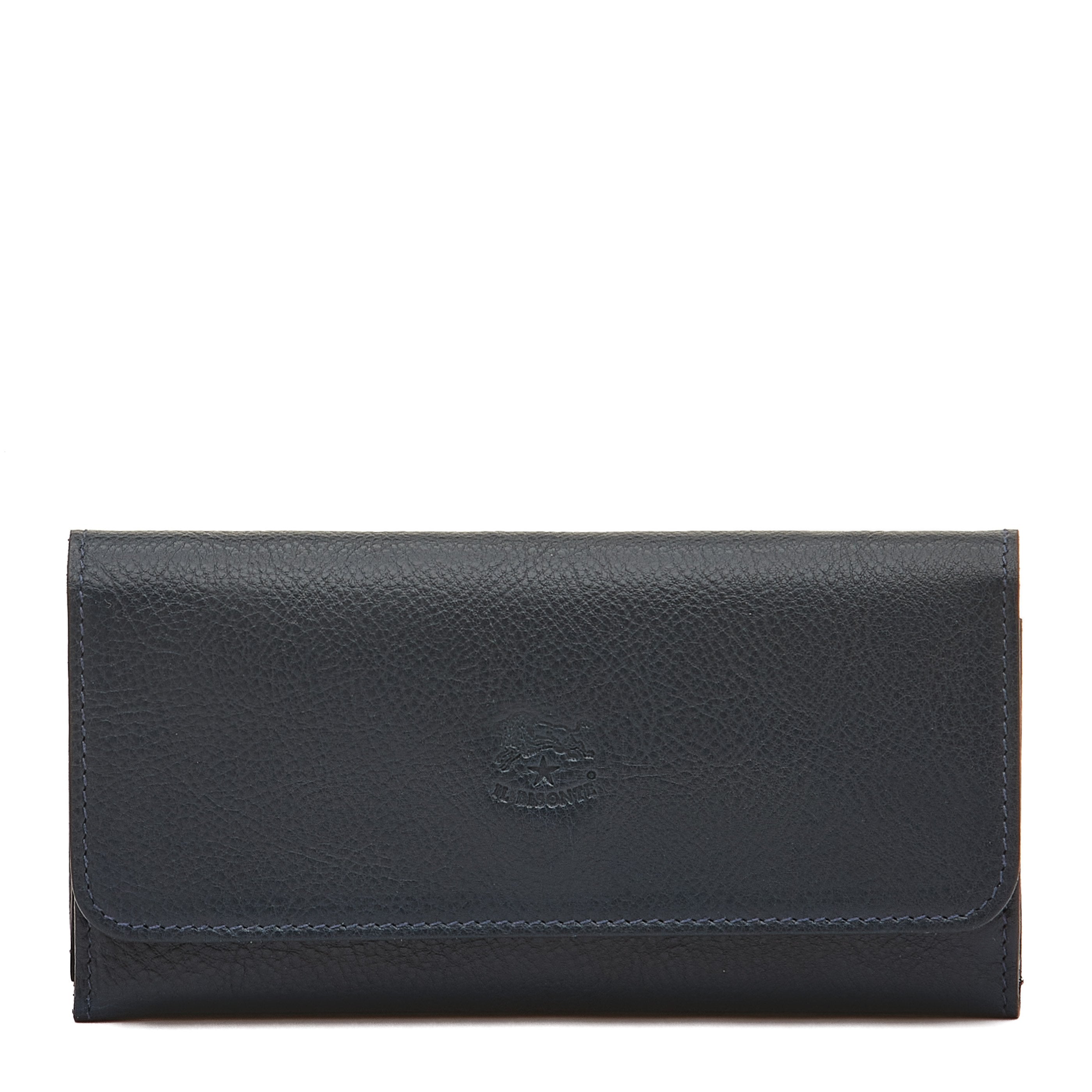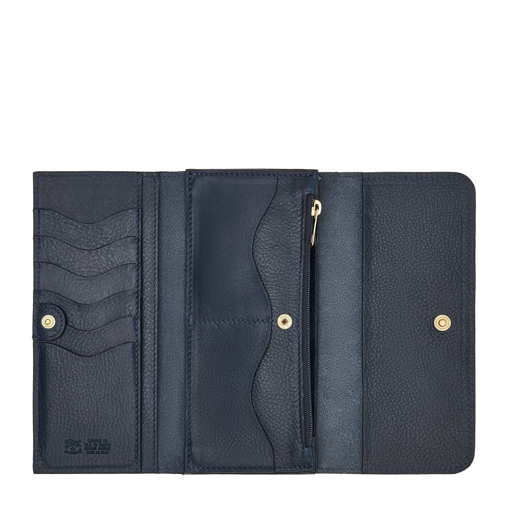 Porte-monnaie pour femme en cuir de vachette à tannage végétal avec fermeture à bouton pression, compartiments pour billets et poches pour pièces de monnaie et cartes de crédit. Produit en Italie par les maîtres artisans de la filière à km 30 de Il Bisonte.L'intérieur, non doublé, contient 3 compartiments ouverts pour billets et docunents, 8 petites poches porte-cartes de crédit et une grande poche porte-monnaie avec fermeture zippée et tirette en laiton.