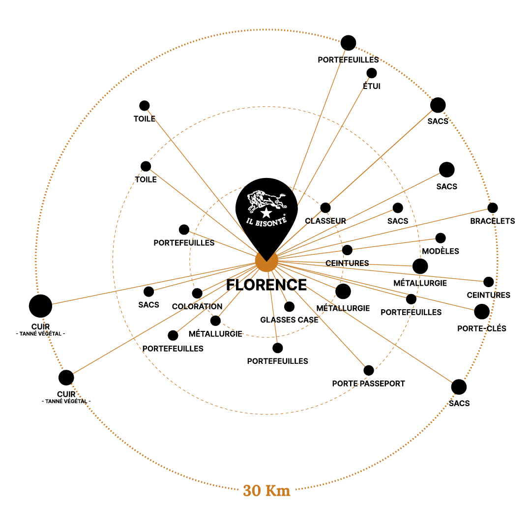 Le cœur de l’univers productif de Il Bisonte est le petit centre de Pontassieve, tout près de Florence. Tous les laboratoires de tannage, découpe, refente, décharnage et couture à la main se trouvent dans un rayon de 30 km.