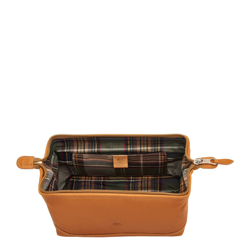 Vanity en cuir de vachette à tannage végétal avec grande ouverture et intérieur doublé en tissu résistant à l'eau. Produit en Italie par les maîtres artisans de la filière à km 30 de Il Bisonte.Fermeture zippée avec tirette en laiton et cuir de vachette. L'intérieur, doublé en tissu résistant à l'eau, contient une poche ouverte en tissu. La structure en métal lui permet de rester complétement ouvert de façon stable pendant l'utilisation.