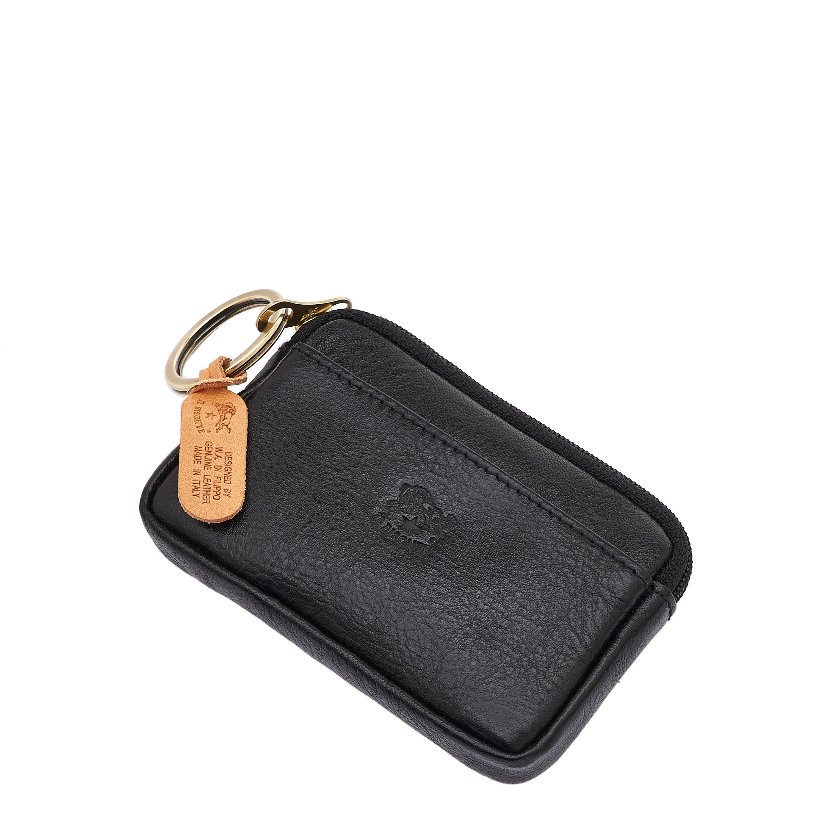 Pochette porte-monnaie unisexe en cuir de vachette à tannage végétal, avec fermeture éclair et anneau. Fabriquée en Italie par les maîtres artisans du circuit court à 30 km de Il Bisonte. Tirette et anneau en laiton doré. Poche frontale en cuir. Intérieur non doublé.