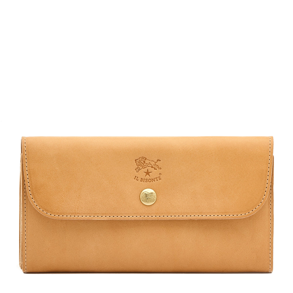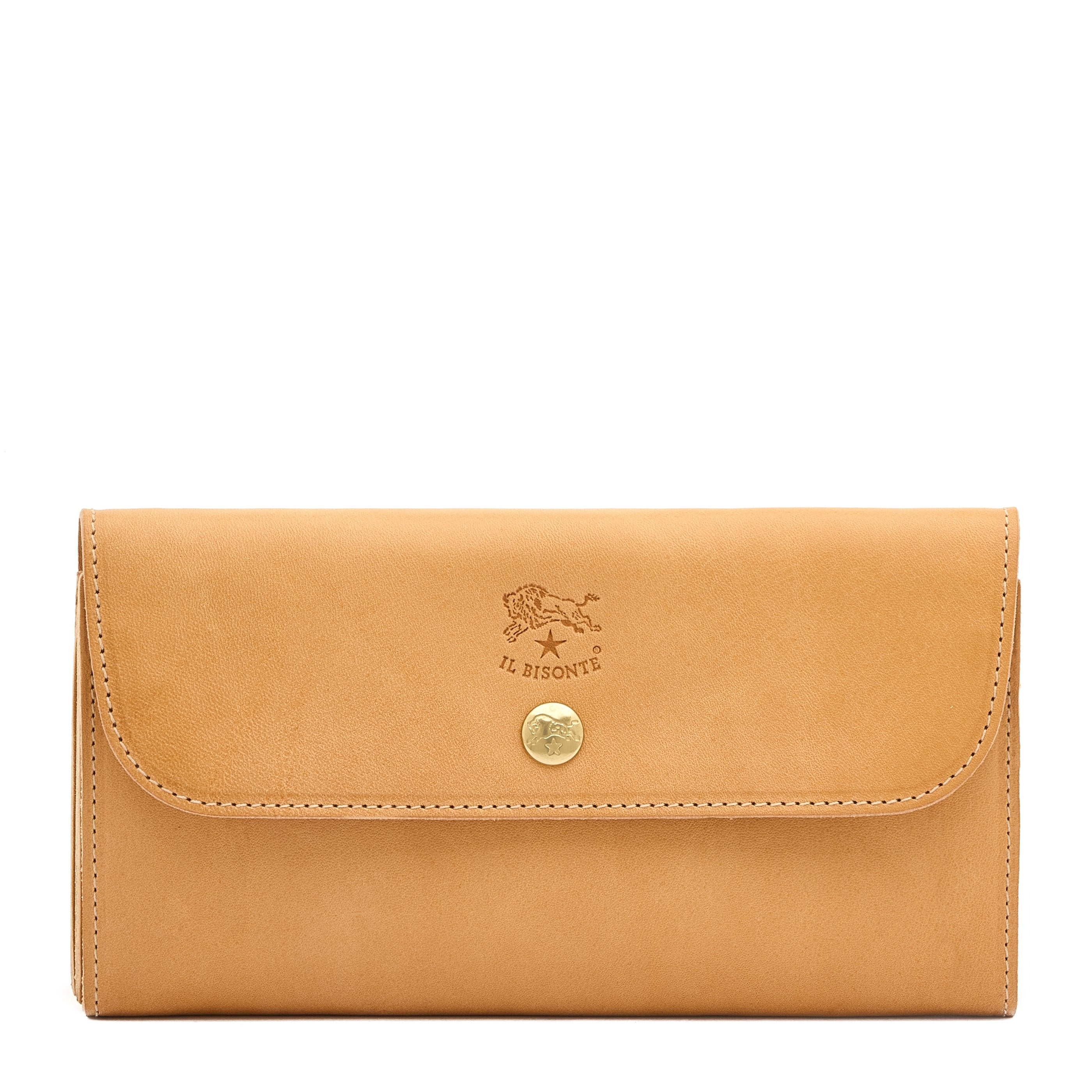Portefeuille continental pour femme en cuir de vachette à tannage végétal. Fabriqué en Italie par les maîtres artisans du circuit court à 30 km de Il Bisonte. Fermeture par bouton pression. 4 compartiments ouverts avec ouverture à soufflet. Bords coupés à vif. Une poche porte-monnaie zippée. 18 petites poches pour cartes de crédit.