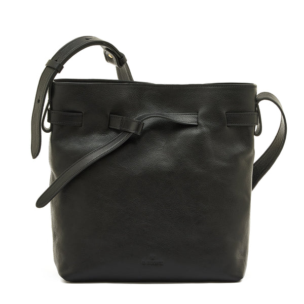 Sac seau pour femme en cuir à tannage végétal. Son design épuré est rendu unique par le cordon en cuir qui en enveloppe le corps. Le sac se porte sur l'épaule ou en bandoulière grâce à la bandoulière réglable à l'aide d'un bouton de col à vis en laiton. Fermeture à l'aide d'un bouton aimanté doublé. L'intérieur, doublé en toile de coton, est doté d'une poche ouverte et d'une lanière pratique fermée à l'aide d'un bouton qui permet d'avoir toujours à portée de main son porte-clés. 100% made in Italy.