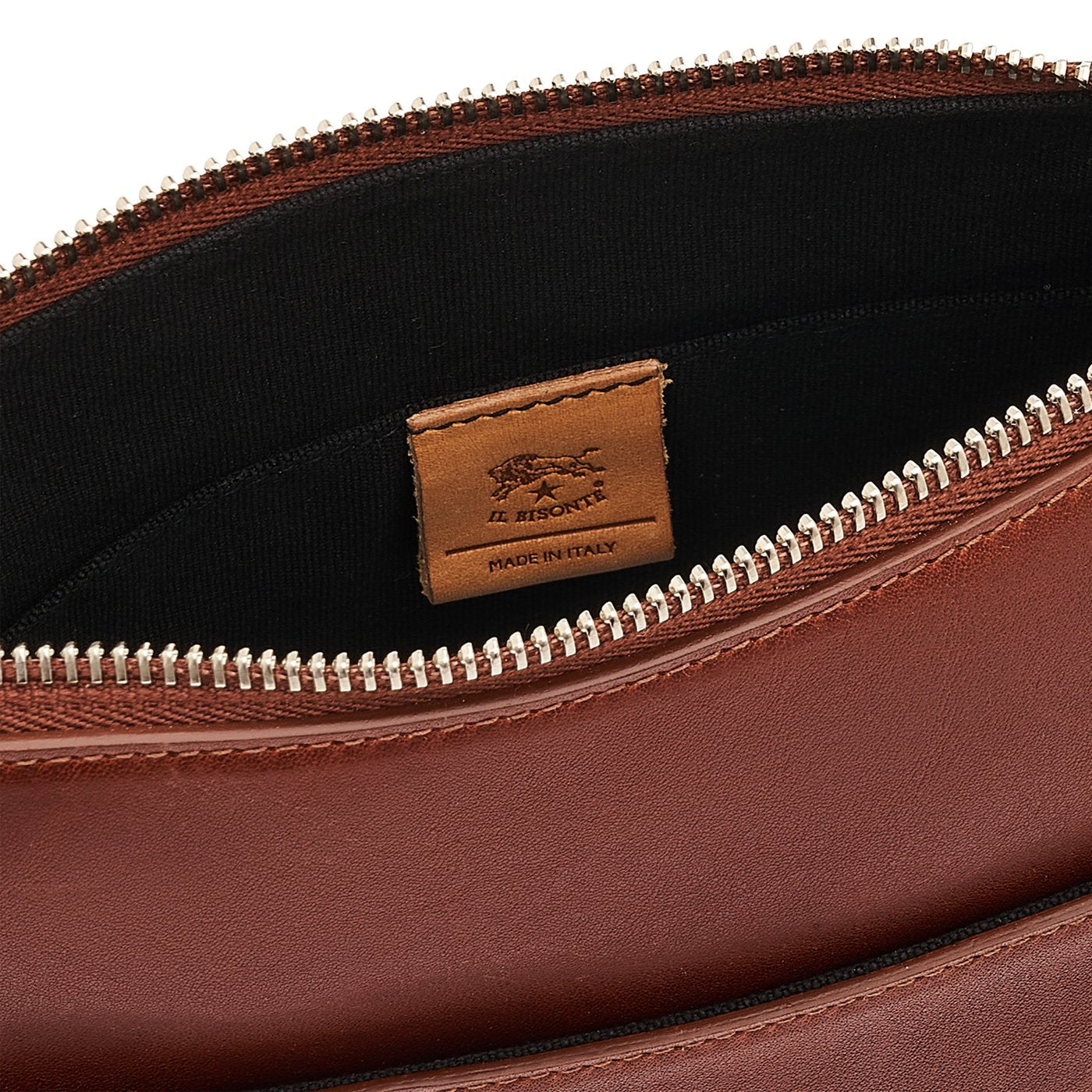 Sac bandoulière en cuir de vachette vintage, minimaliste et versatile. Bandoulière en ruban de nylon réglable à l'aide d'une boucle coulissante. Poche extérieure avant ouverte, doublée en toile de coton. Fermeture éclair en métal avec tirette en cuir. L'intérieur, doublé en toile de coton, abrite une petite poche ouverte pour votre smartphone. 100% made in Italy, ce sac est produit près de Florence par les maîtres artisans du circuit court de 30 km de Il Bisonte.