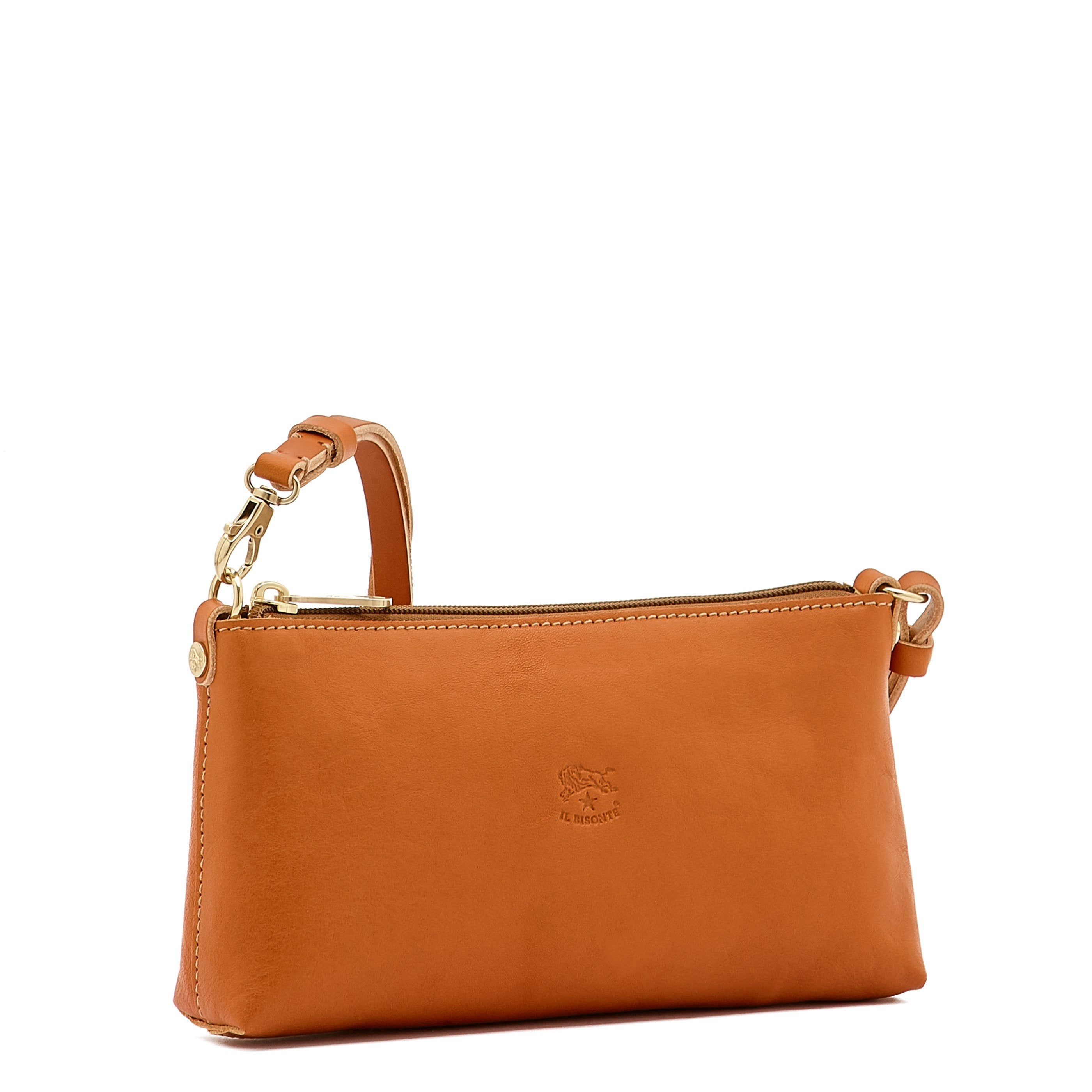 Sac épaule pour femme en cuir de vachette à tannage végétal, avec bandoulière réglable. Fabriqué en Italie par les maîtres artisans du circuit court à 30 km de Il Bisonte. Bandoulière fixée au corps du sac par un mousqueton et un anneau en laiton doré. La longueur de la bandoulière se règle à l'aide d'un bouton pression. Fermeture zippée avec tirette en laiton. Intérieur non doublé.