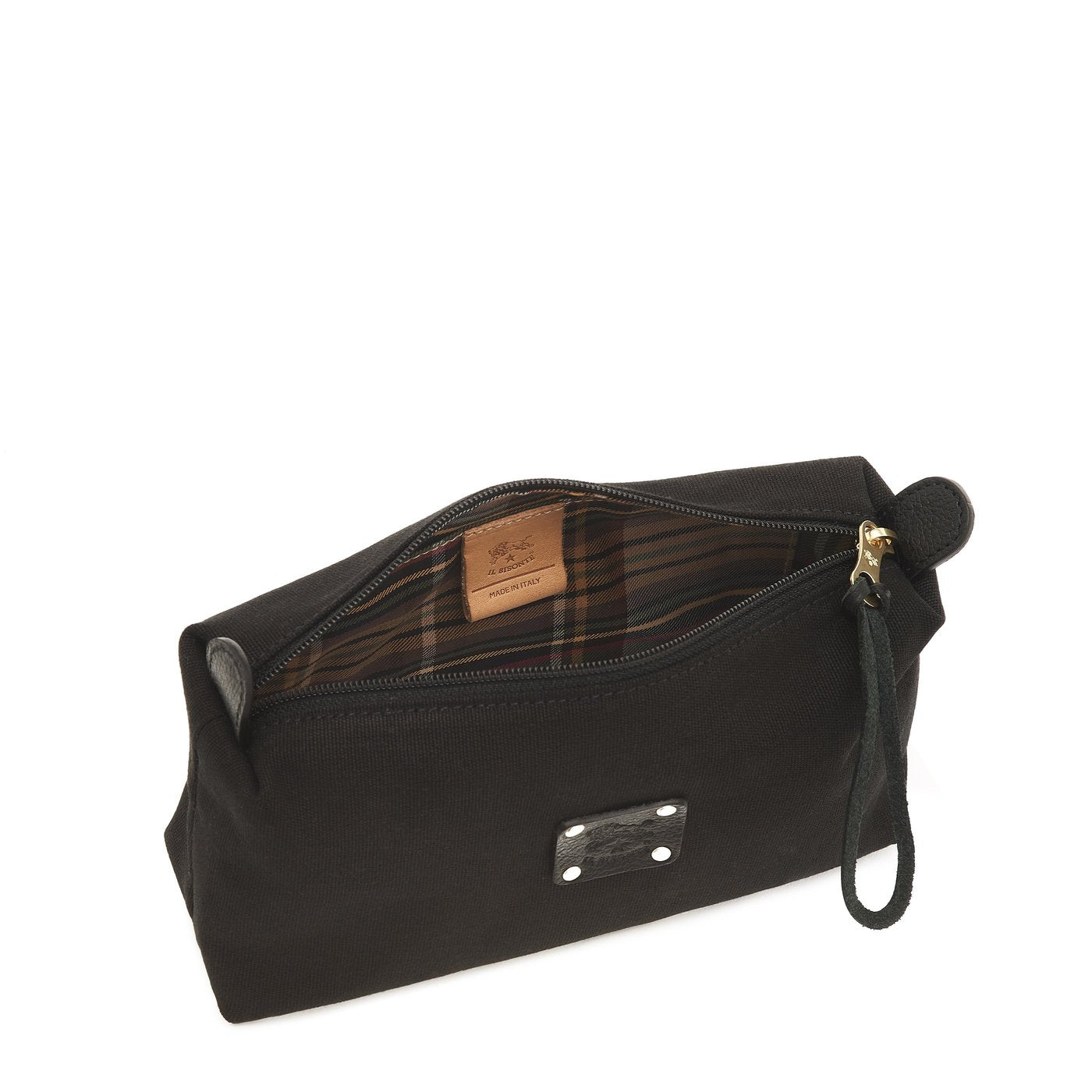 Vanity en cuir de vachette à tannage végétal et coton. Produit en Italie par les maîtres artisans de la filière à km 30 de Il Bisonte.Fermeture zippée avec tirette en laiton et lanière en cuir de vachette. L'intérieur, doublé en coton, contient une petite poche ouverte.