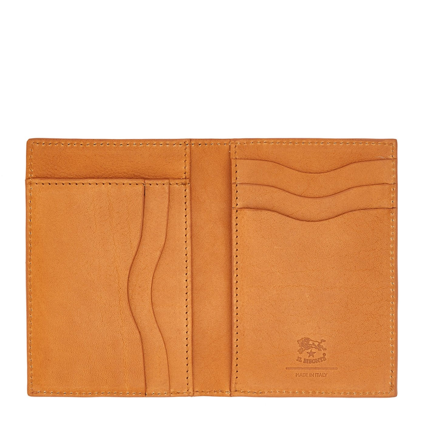 Porte-cartes en cuir vintage à tannage végétal avec poche extérieure au profil iconique en forme de vague. À l'intérieur, cinq petites poches pour les cartes et trois compartiments. 100% made in Italy, ce porte-cartes est produit près de Florence par les maîtres artisans du circuit court de 30 km de Il Bisonte.