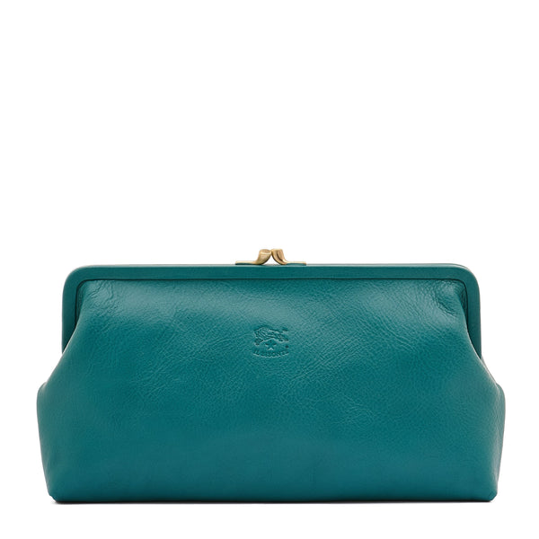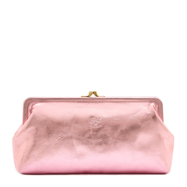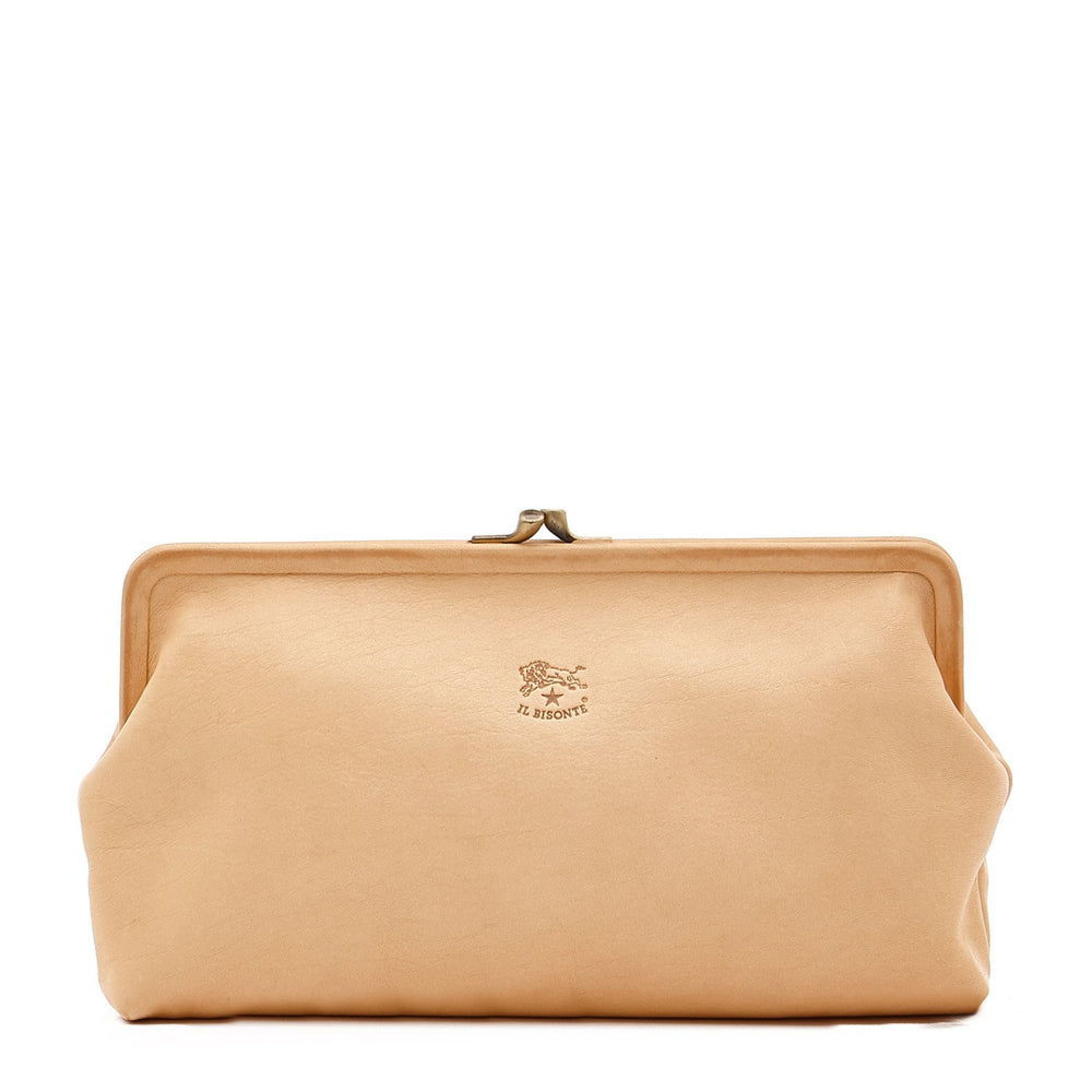 Pochette da donna in pelle di vacchetta conciata al vegetale con chiusura rétro a scatto. Prodotta in Italia dai maestri artigiani della filiera a km 30 de Il Bisonte. L'interno, foderato in tela di cotone, ospita una taschina aperta.