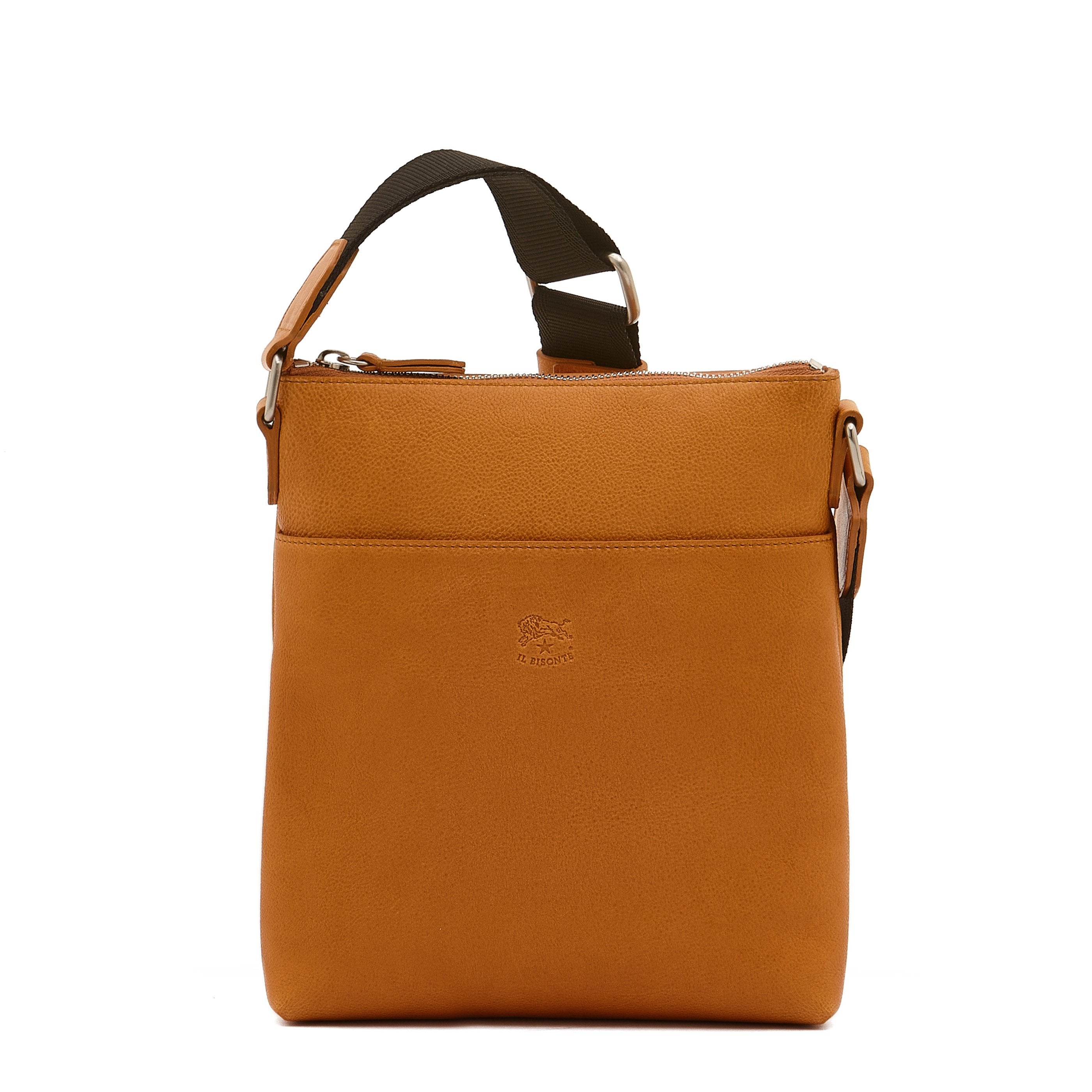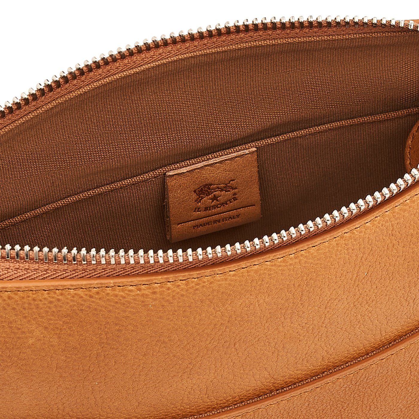 Borsa a tracolla in pelle di vacchetta vintage, essenziale e versatile. Tracolla in nastro di nylon regolabile con scorrevole. Tasca esterna frontale aperta, foderata in tela di cotone. Chiusura con zip di metallo e tiralampo in pelle. L'interno, foderato in tela cotone, ospita una taschina aperta porta-cellulare. 100% made in Italy, è prodotta in provincia di Firenze dai maestri artigiani della filiera a KM30 de Il Bisonte.