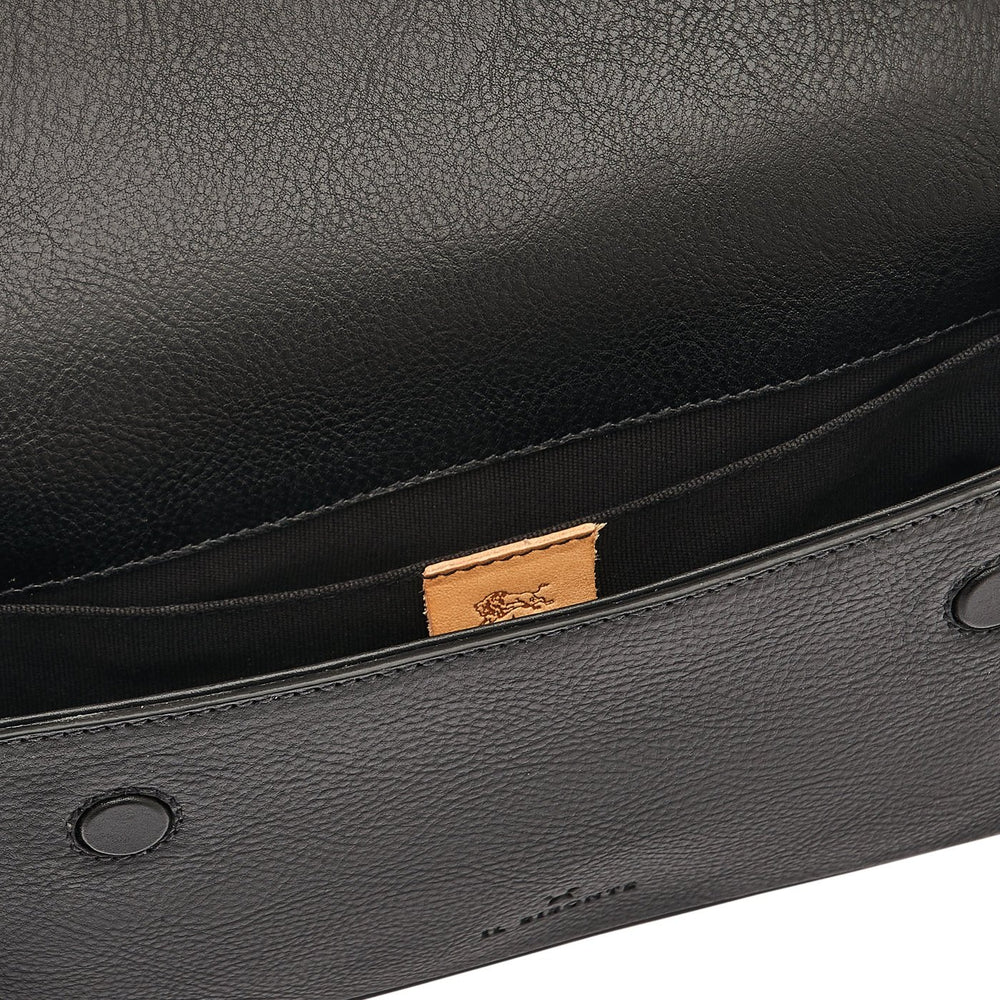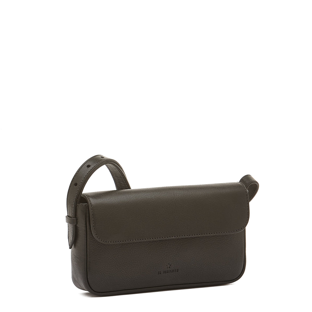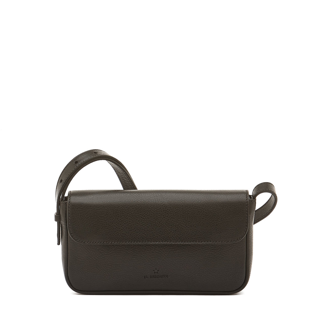 Piccola borsa in pelle di vacchetta conciata al vegetale a doppia portabilità, indossabile a tracolla o a spalla. Il suo design essenziale è frutto di una lavorazione artigianale accuratissima. Tracolla regolabile con fibbia. Chiusura con bottoni magnetici nascosti sotto la patta. Sottopatta in pelle. L'interno, foderato in tela di cotone, ospita una tasca porta cellulare aperta. 100% made in Italy, è prodotta in provincia di Firenze dai maestri artigiani della filiera a KM30 de Il Bisonte.