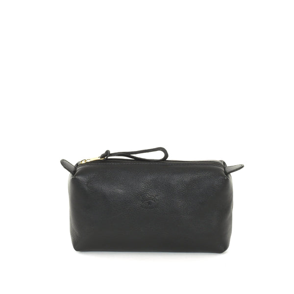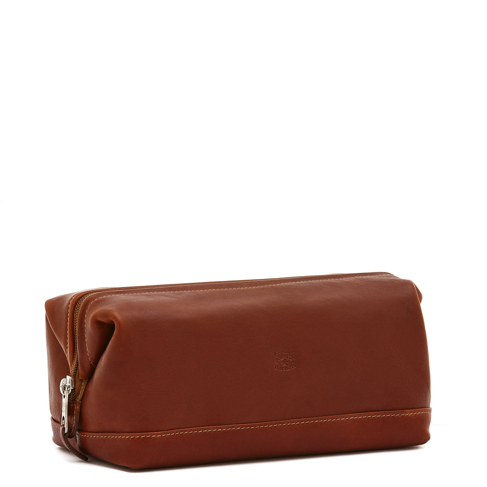 Beauty-case in pelle di vacchetta conciata al vegetale con ampia apertura e interno foderato in tessuto impermeabile. Prodotto in Italia dai maestri artigiani della filiera a km 30 de Il Bisonte. Chiusura a zip con tiralampo di ottone e pelle di vacchetta. L'interno, in tela impermeabile, ospita una tasca aperta in tessuto. La struttura in metallo gli permette di rimanere completamente e stabilmente aperto durante l'utilizzo.