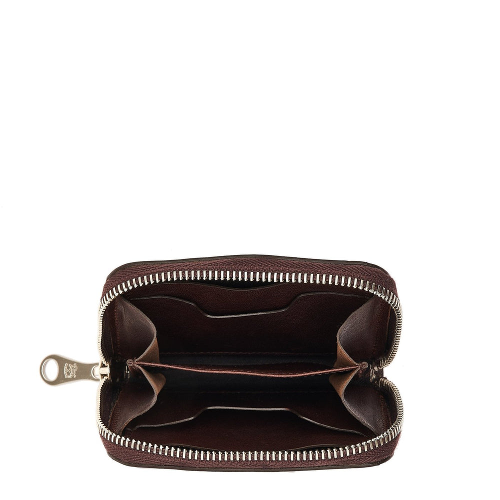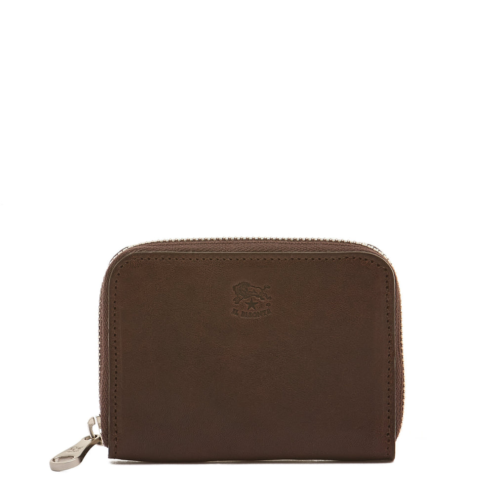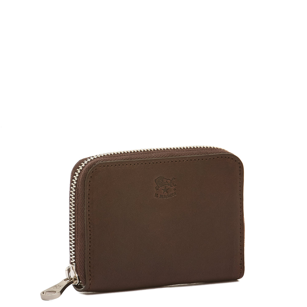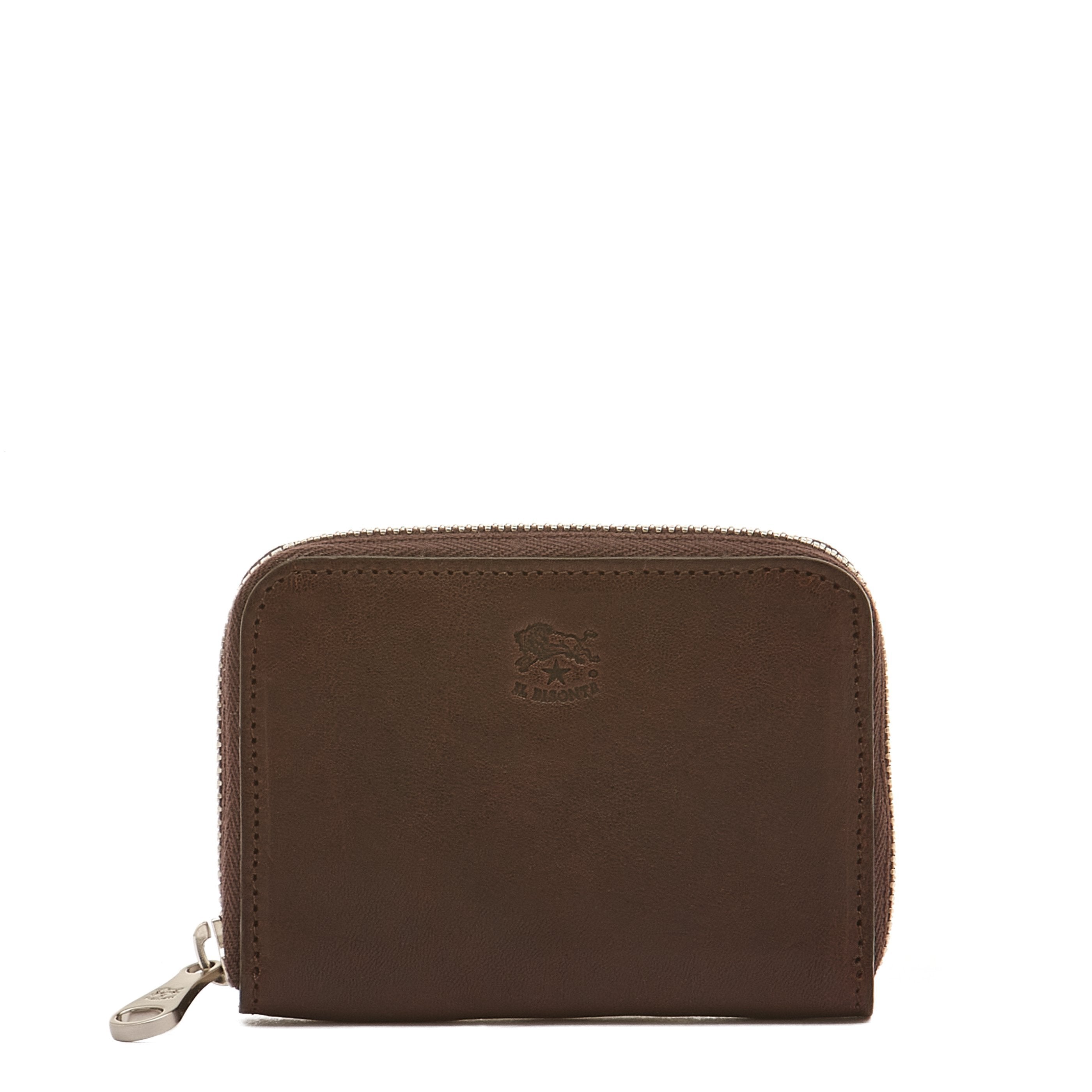 Piccolo portafogli zip around in pelle di vacchetta conciata al vegetale con apertura a soffietto. All'interno ospita due scomparti, ciascuno con due tasche porta carte di credito sagomate con profilo geometrico. Interno foderato in tela di cotone. 100% made in Italy, è prodotto in provincia di Firenze dai maestri artigiani della filiera a KM30 de Il Bisonte.