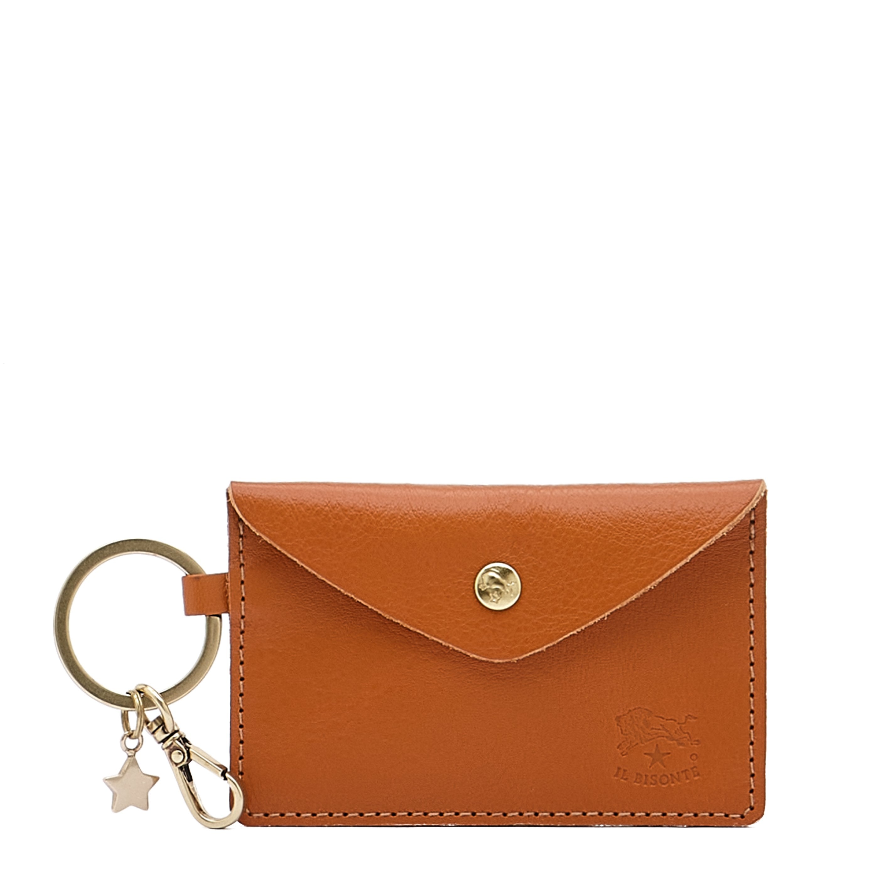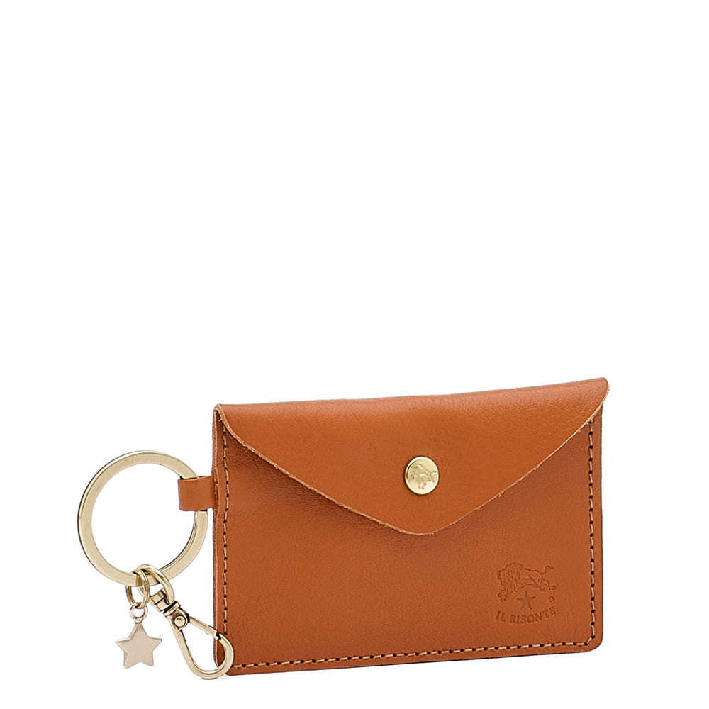 Portachiavi ad anello da donna con stellina decorativa in ottone e bustina portacarte in pelle di vacchetta conciata al vegetale. Prodotto in Italia dai maestri artigiani della filiera a km 30 de Il Bisonte. Anello, moschettone e stellina di ottone finitura oro. Bustina in pelle con chiusura con bottone automatico e interno sfoderato.