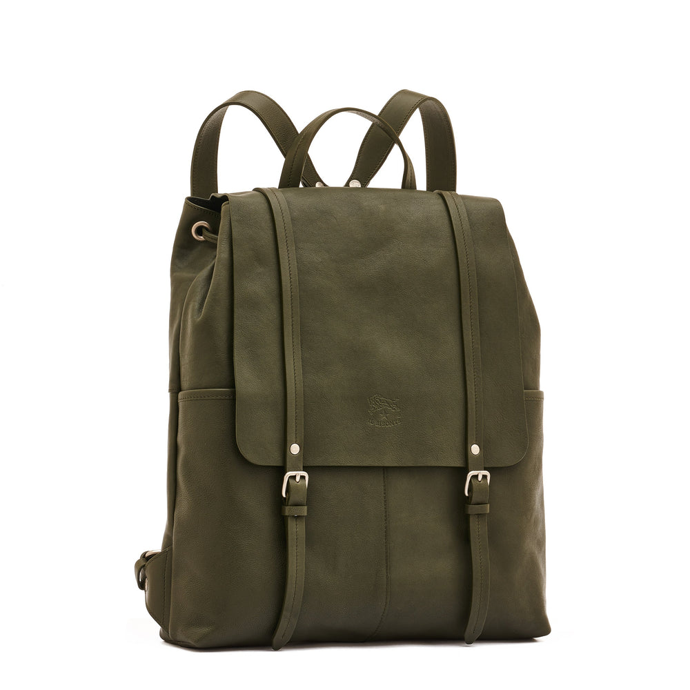 Zaino da uomo con spallacci regolabili con fibbia. Sotto la patta, chiusa da bottoni automatici a scomparsa, due tasche aperte. Chiusura con coulisse di pelle. Due scomparti interni foderati in tela di cotone. Tasca interna con zip. 100% made in Italy, è prodotto in provincia di Firenze dai maestri artigiani della filiera a KM30 de Il Bisonte.
