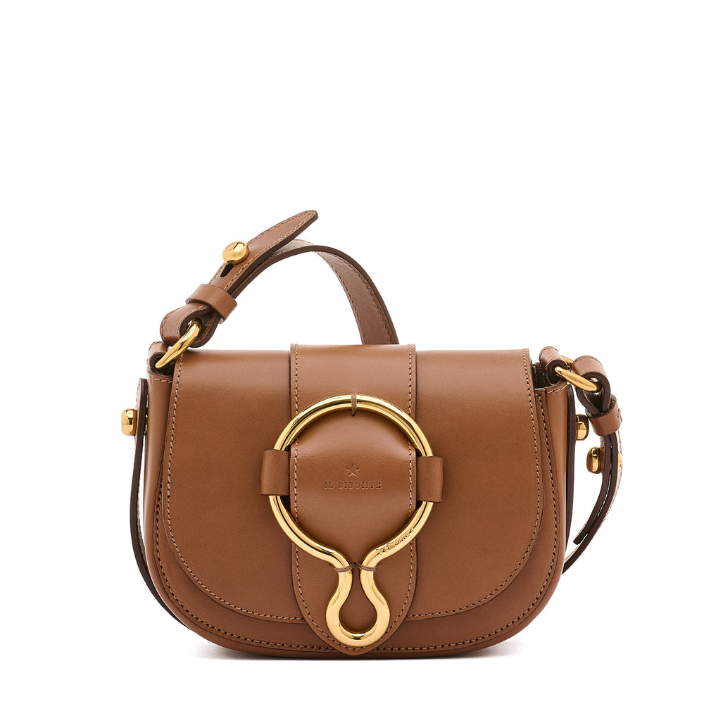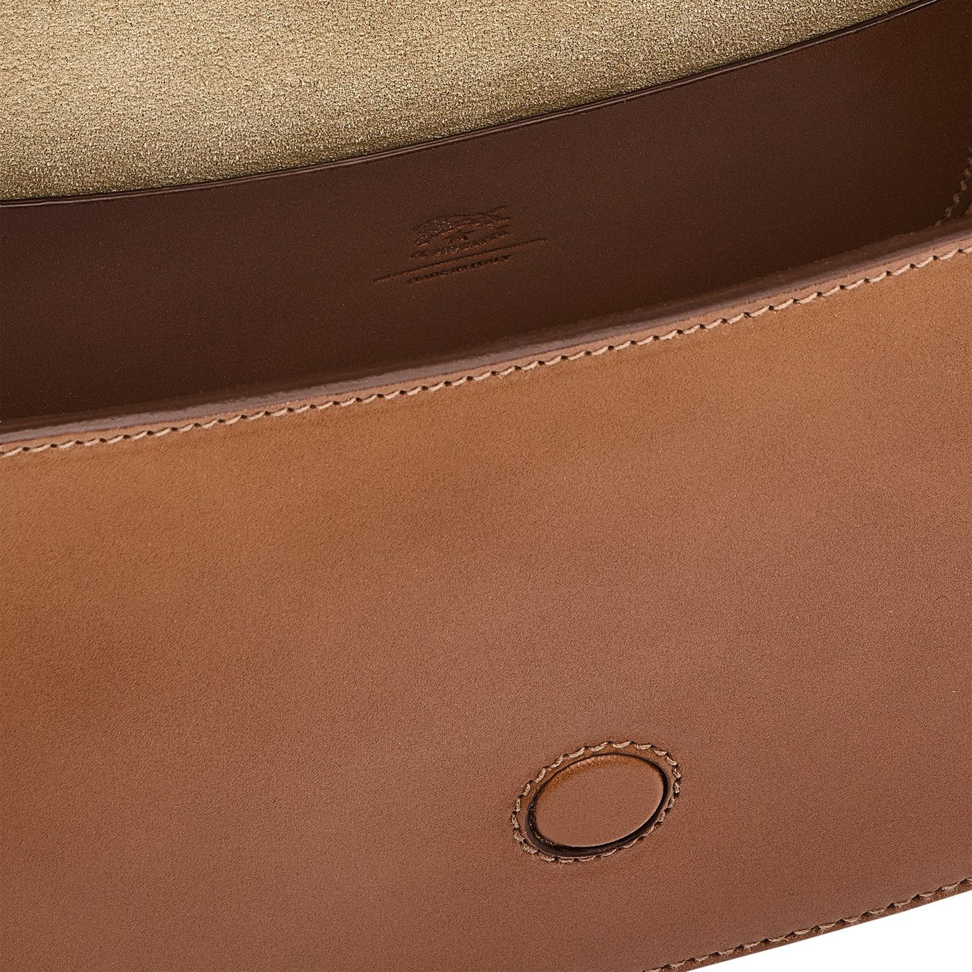Borsa da donna a mano e a tracolla in pelle di vacchetta conciata al vegetale, con patta, anello di ottone e nappina removibile. Prodotta in Italia dai maestri artigiani della filiera a km 30 de Il Bisonte. Il manico può sparire sul fondo della borsa. Tracolla regolabile e removibile. Nappina removibile in pelle di vacchetta. Chiusura sotto-patta con bottone magnetico. L'interno, foderato in suede, ospita una piccola tasca in pelle.