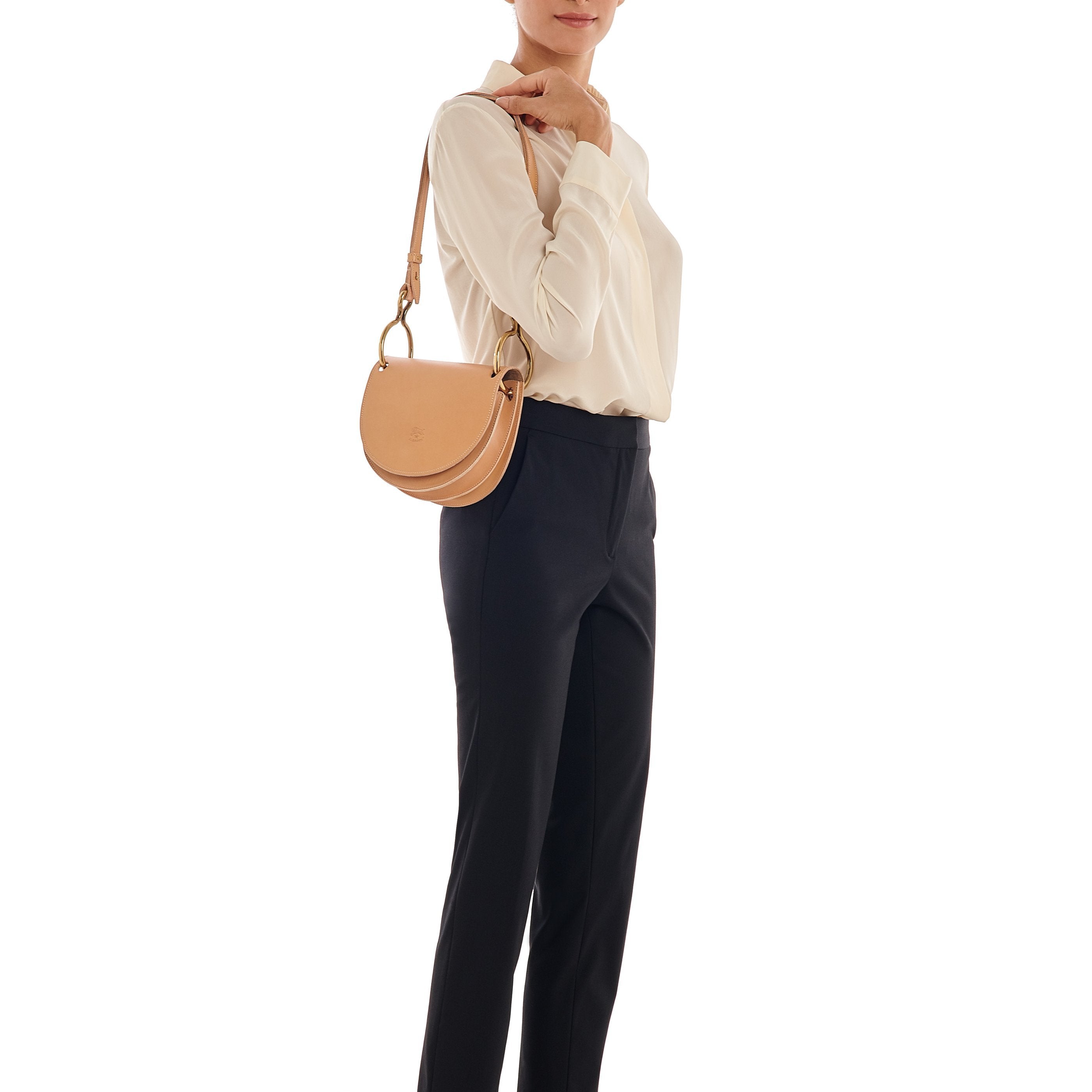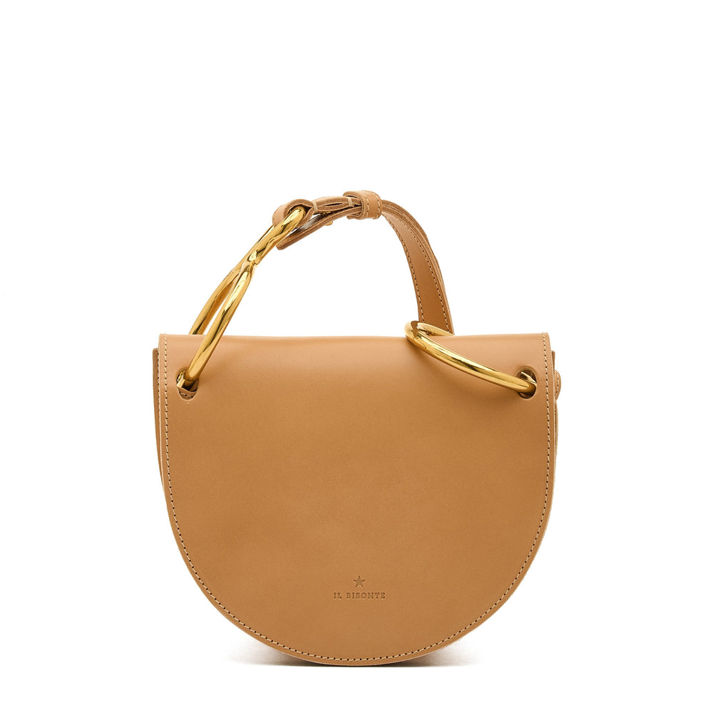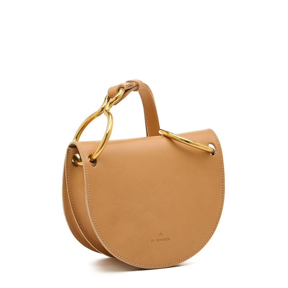 Borsa da donna in pelle di vacchetta conciata al vegetale con grandi anelli-gioiello in ottone, patta e tracolla regolabile. Made in Italy.Si indossa cross-body o a spalla regolando la lunghezza della tracolla con gemelli di ottone. Chiusura sotto-patta con bottone magnetico. Apertura a soffietto. L'interno, foderato in suede, ospita una doppia taschina aperta per carte di credito e documenti.